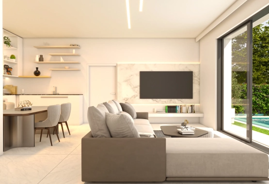This modern ground-floor unit features bright, open spaces enhanced by large glass openings that create a natural flow between the interior and the private outdoor pool area.
