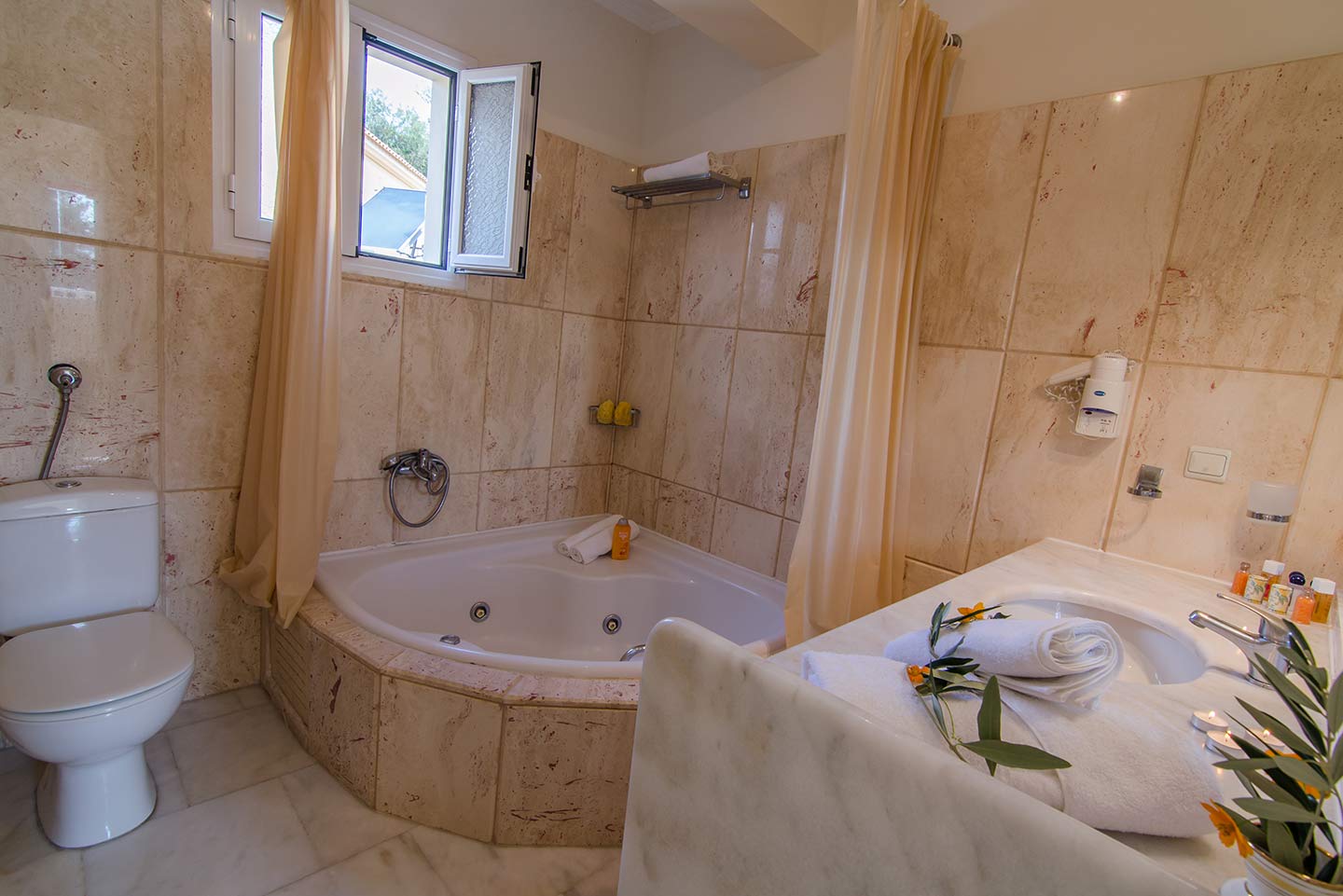 • Ground floor bedroom: The ground floor hosts a large and airy bedroom with fitted wardrobes and a washbasin. Double doors open onto the inviting terrace outside. The marble bathroom, designed in a Jack and Jill style, features a luxurious jacuzzi/shower.