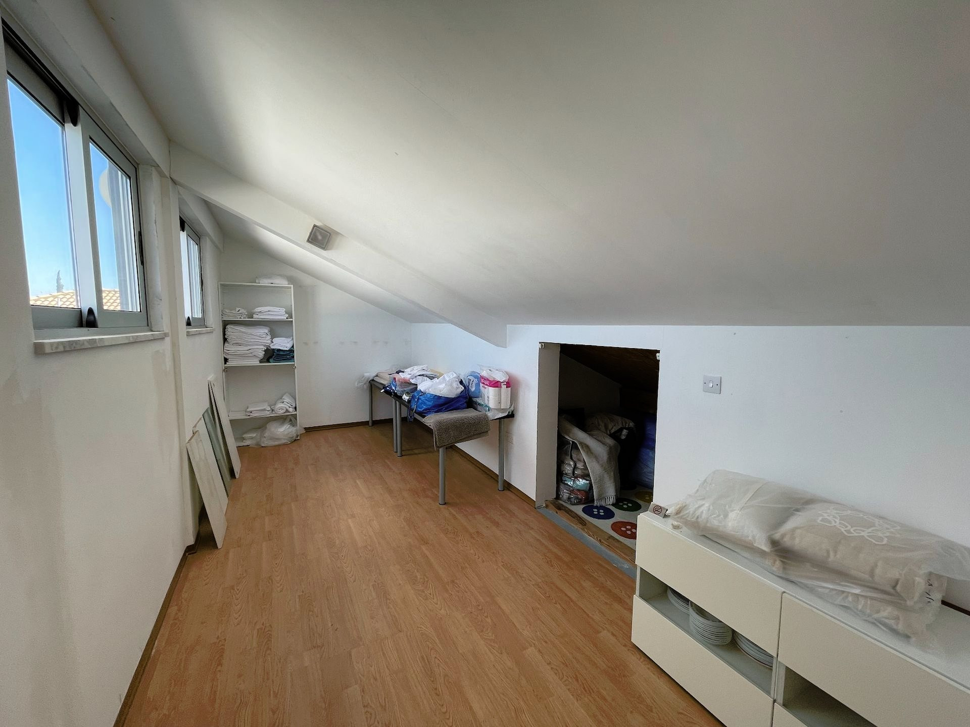 Stairs lead up to the second floor where you will find a large storage room (previously used as an office) and access to the roof terrace/roof garden, with far-reaching views of the surrounding area and housing the tank room.