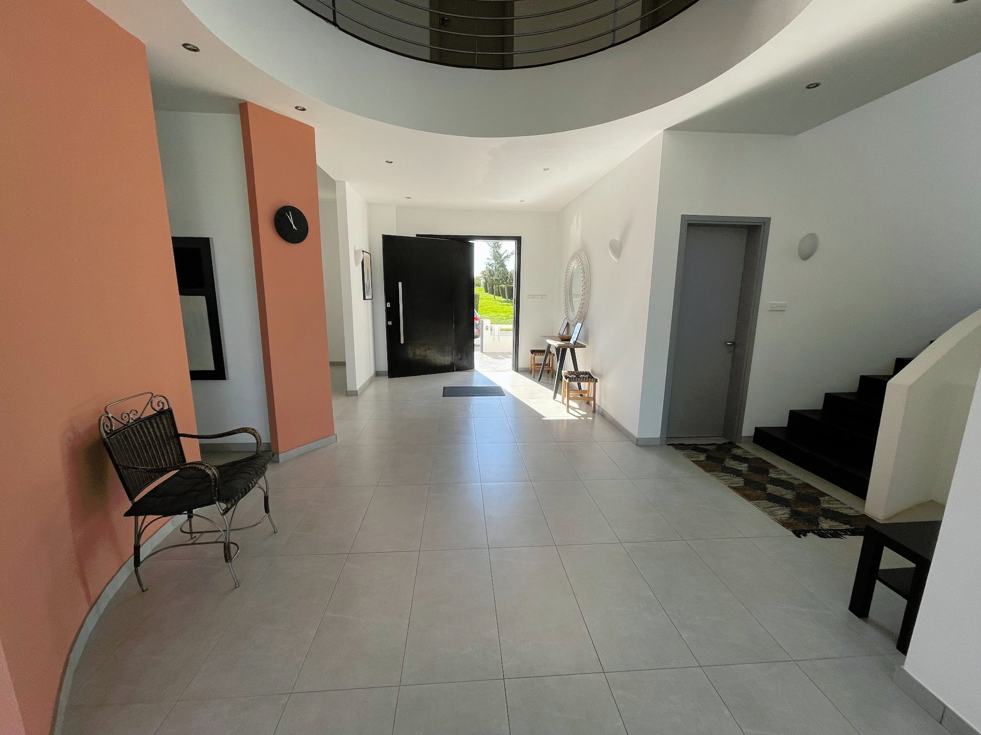 The central atrium with a circular gallery creates a light and airy feel. There are five, bright bedrooms, all with walk-in wardrobes, and four also have en-suite shower rooms. In addition, there is a family bathroom with a large, double-ended bath. Three of the bedrooms enjoy covered verandas overlooking the garden and mountain views, and the other two have mezzanine levels. The first floor also has a spacious laundry room.
