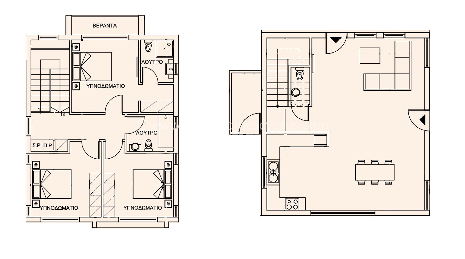 This complex of 15 similar properties is set around a cul de sac road in a quiet area of Avgorou. This particular corner plot features an open plan ground floor layout which incorporates living, kitchen and dining area. The living area offers plenty of natural light from the patio doors which give access to the wraparound garden. There is also a handy guest WC at ground floor level.