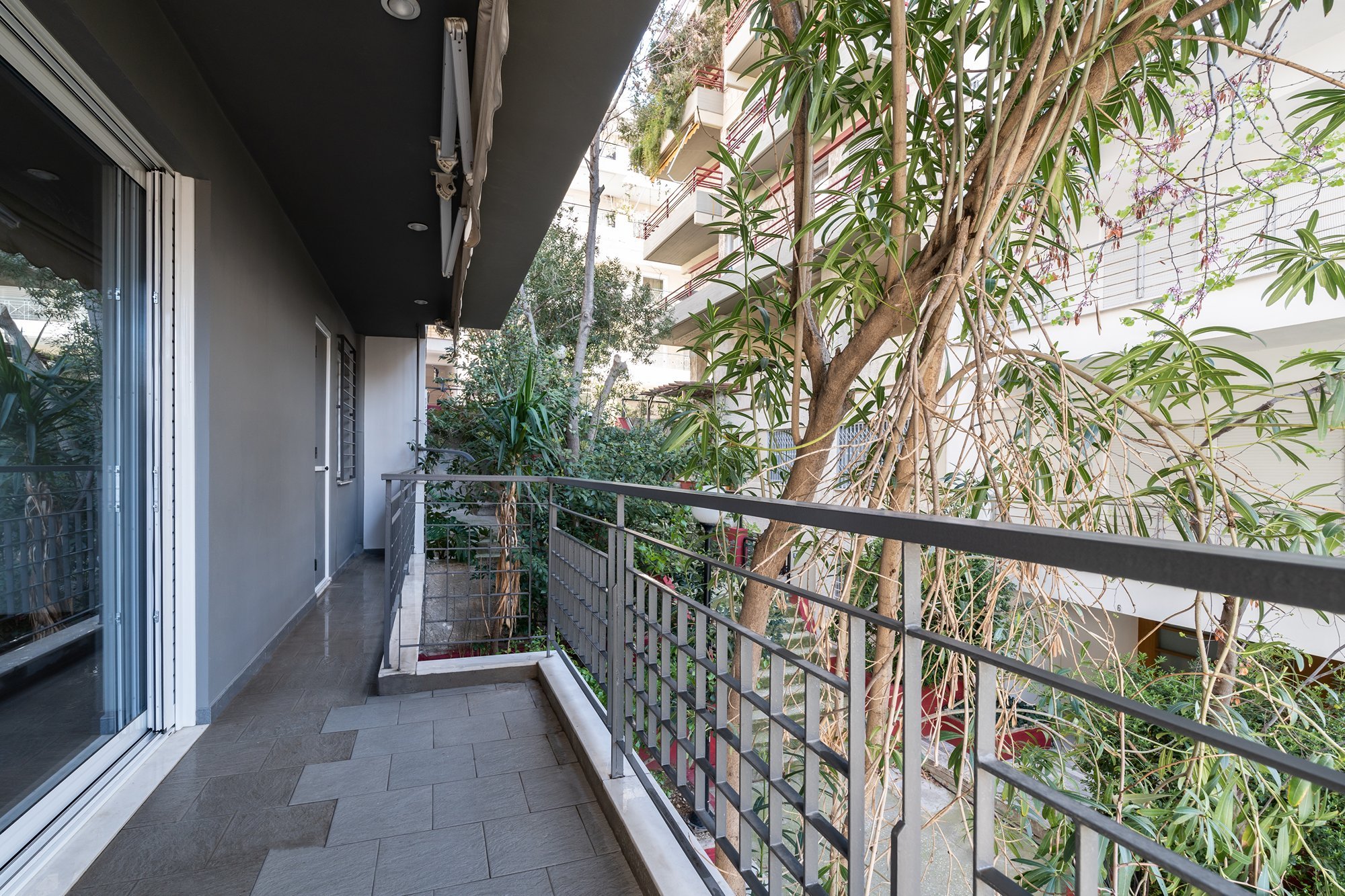 Natural light streams through large windows and two front and rear balconies, enhancing the sense of openness.
