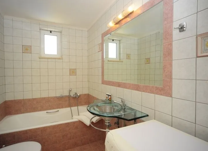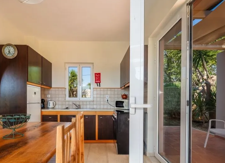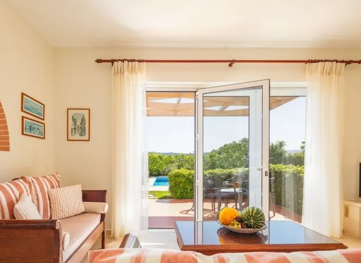 The ground floor features a fully equipped kitchen and a spacious living room with a fireplace, designed to frame relaxing views over the pool. The master bedroom includes a double bed and direct access to the veranda, making it ideal for morning coffee or evening downtime. A modern, comfortable bathroom completes this level.