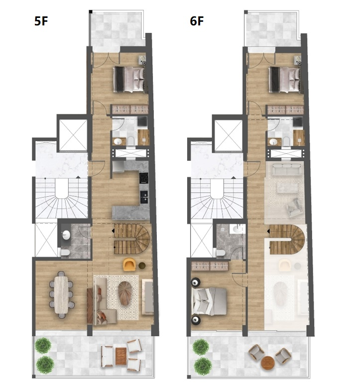 A modern 158 m² maisonette located on the 5th and 6th floors, currently under construction (2024). It features three bedrooms (including one master), three bathrooms, a guest WC, a spacious living and dining area, and a contemporary kitchen. The property is Energy Class A+ and includes a 9 m² storage room and underground parking with electric vehicle charging provision.