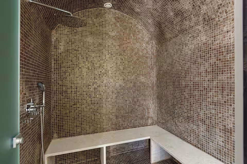 The villa is arranged over two levels and features a bright, contemporary interior with high-quality finishes throughout. The ground floor offers a spacious living area with a 55'' TV and satellite channels, a fully equipped modern kitchen, and a large dining space. It also includes four en-suite bedrooms, two of which have independent entrances, while one features a private hammam. A guest WC is also available on this level.