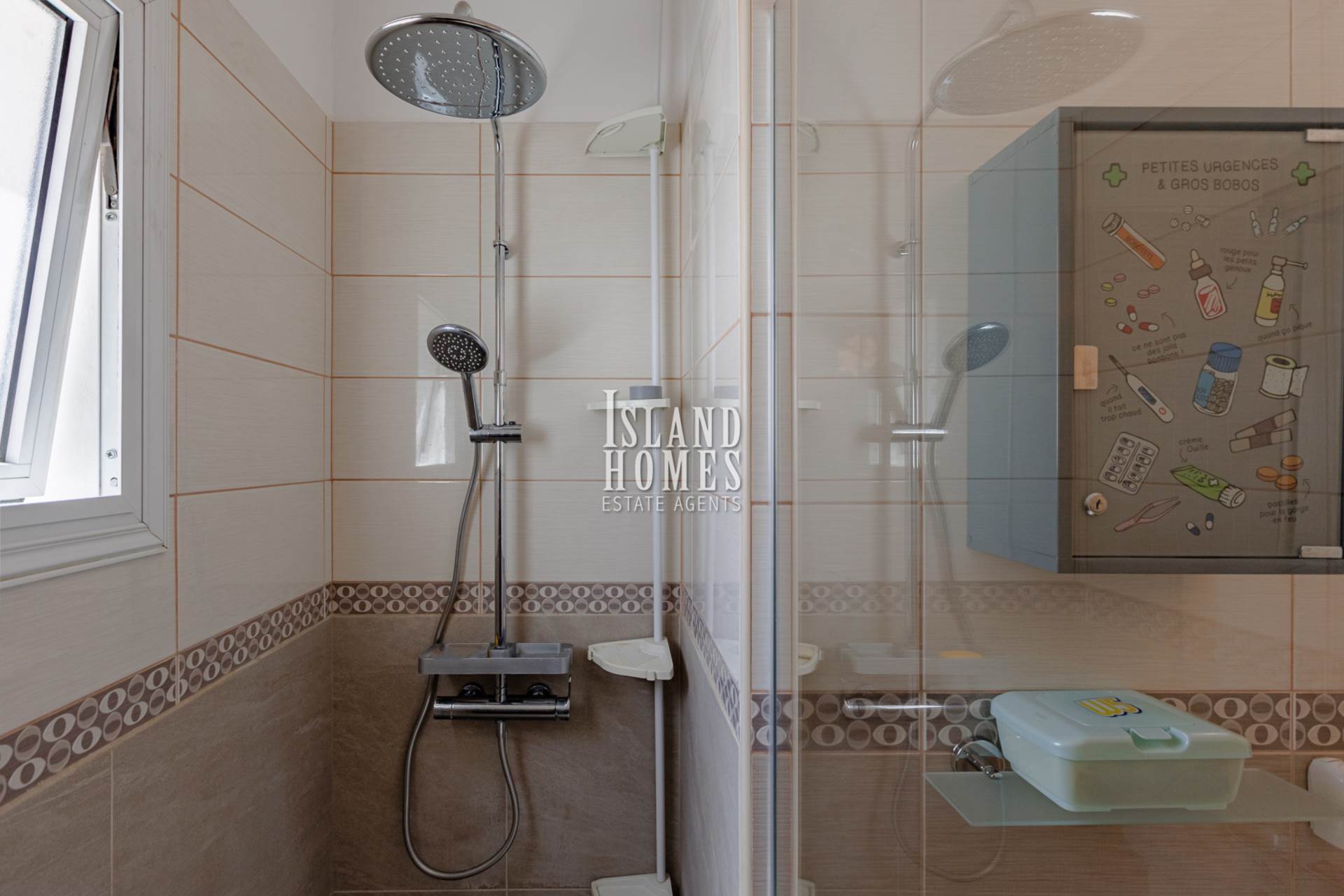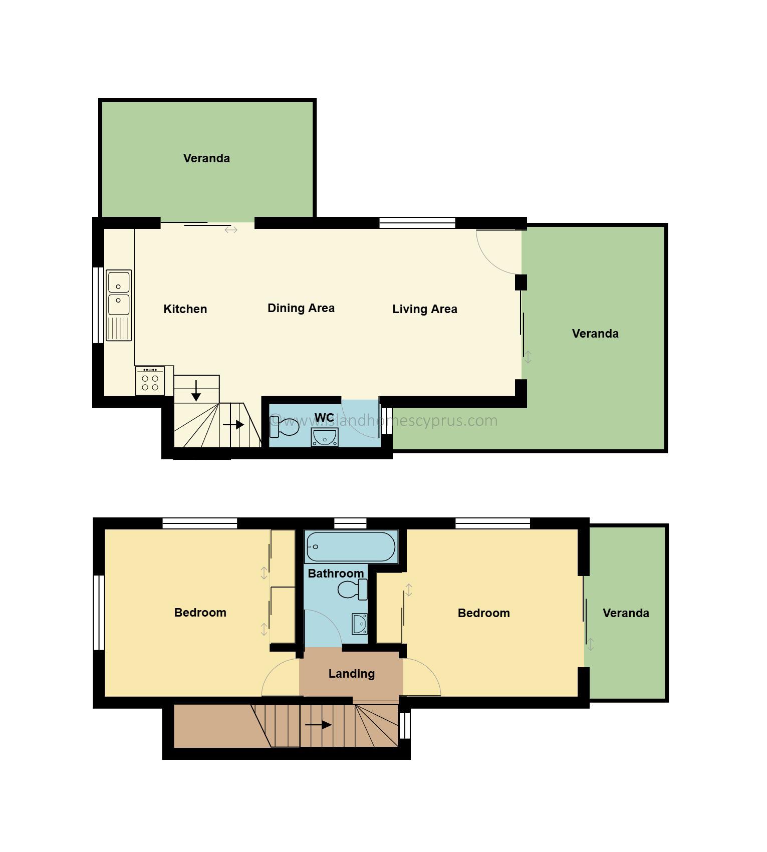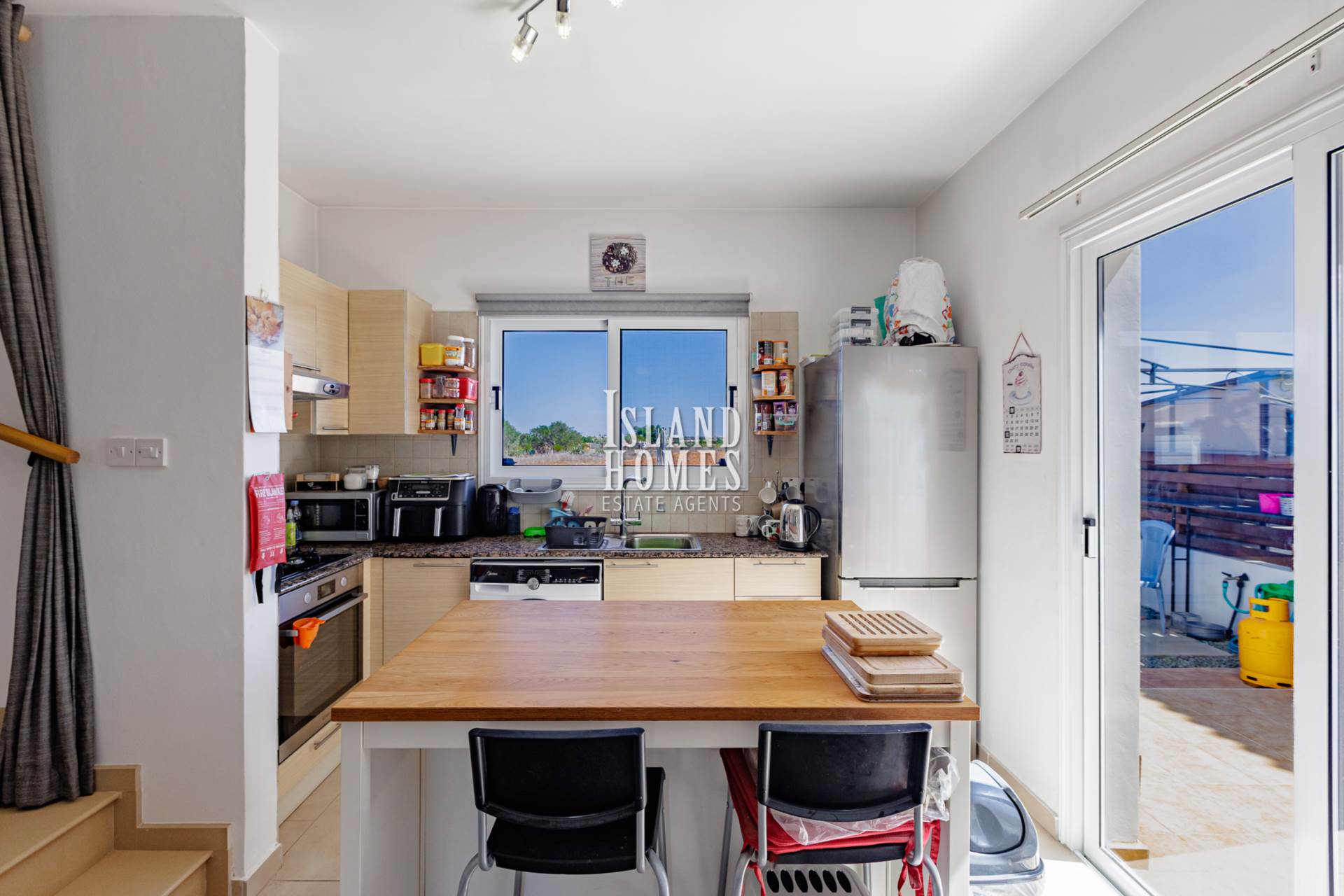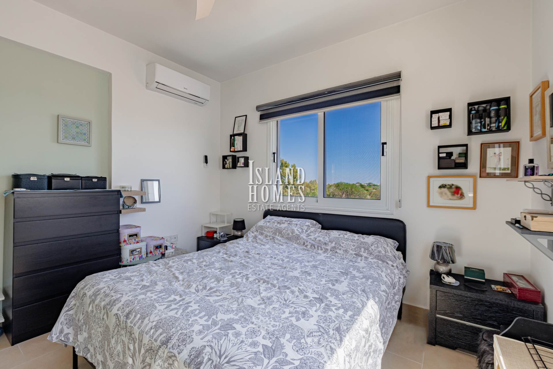 This semi detached property sits on a well maintained development on the outskirts of Frenaros village. With a gated driveway offering off street covered parking the property includes a raised side veranda and a seating area at the rear. The front door enters into the open plan living, dining and kitchen area with a handy guest WC at ground floor level. The living area boasts a cosy log burner for the short winter months. The kitchen includes an island which doubles as a handy breakfast bar and offers plenty of natural light from the window over the sink which offers views over local fields as well as the patio doors which offer access to the raised veranda at the side of the house.