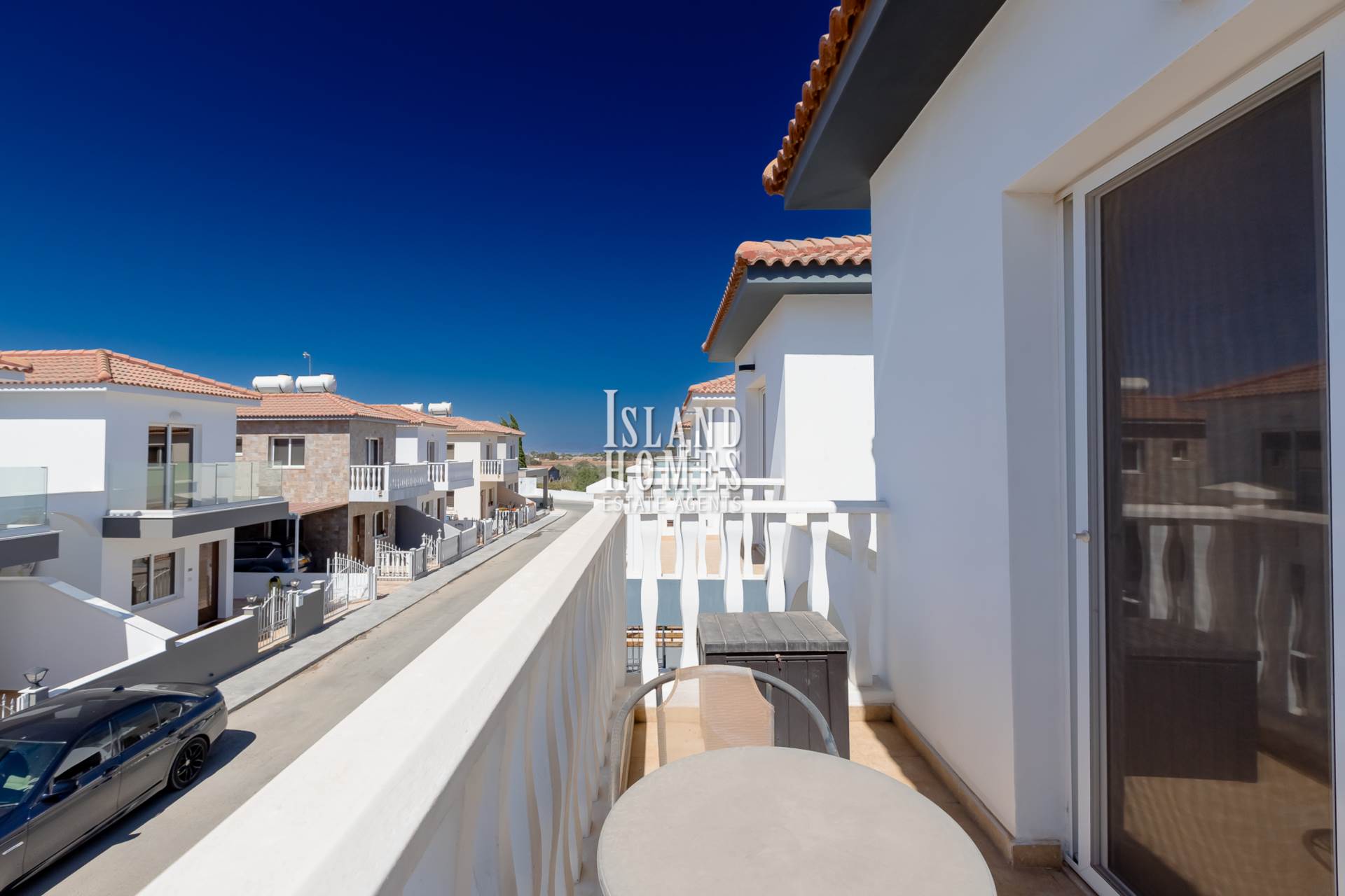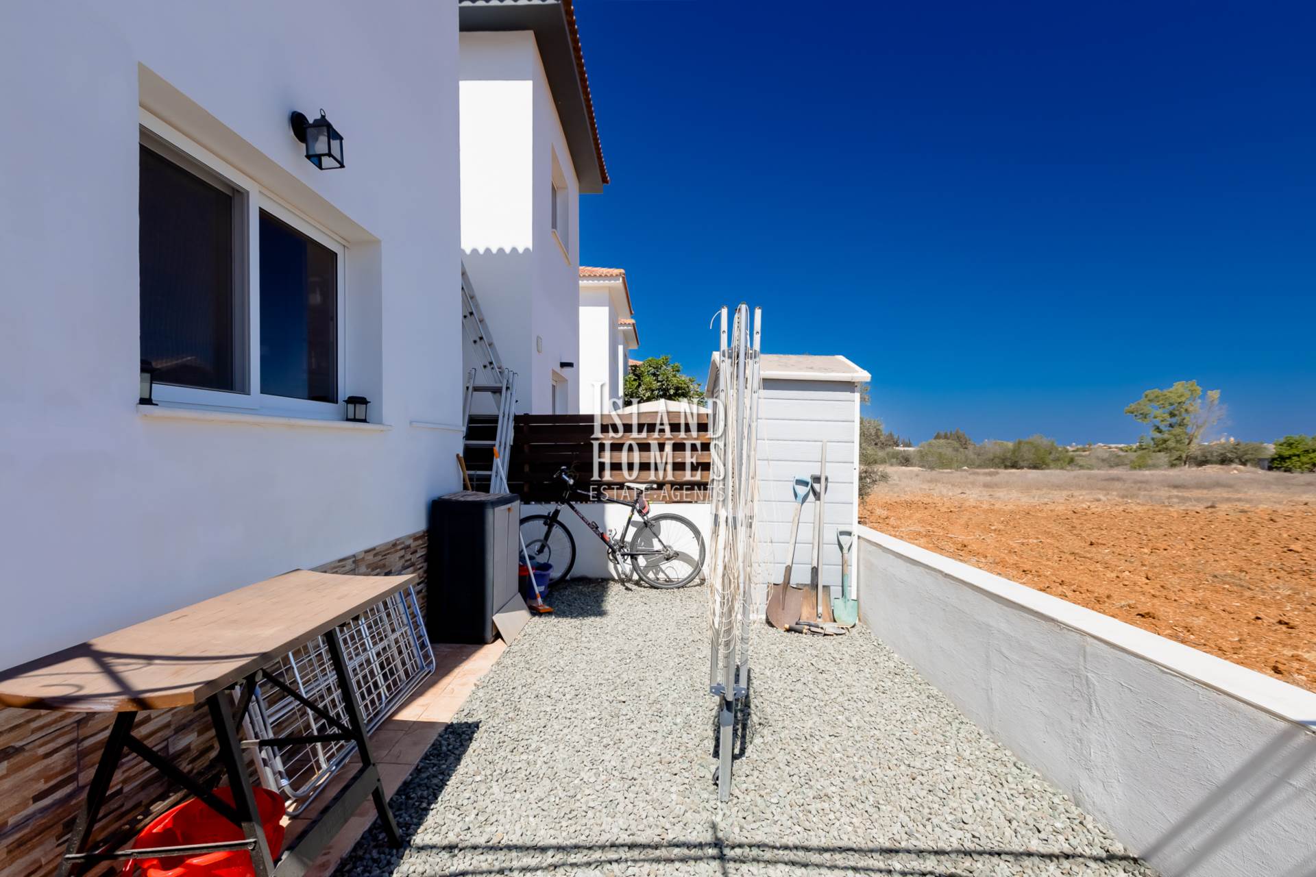 The plot offers garden and patio space at both the front and the back of the house, as well as off street, covered parking. The back garden is fenced for privacy and security and has an electric awning. Offered for sale part furnished this is a fantastic opportunity to own a town house on the outskirts of the popular village of Frenaros with the village of Deryneia also a short drive away. The nearest supermarket is less than 1.5km from the complex. This property would make a super retire to the sun home or a great long term rental opportunity.