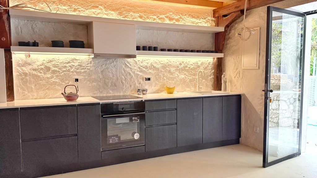 Nestled in a peaceful and authentic setting in the midst of the picturesque village, this property offers style, comfort, and timeless appeal. Double-heights, open ceilings, and modern elements made out of steel complete the contemporary finish of the house. The flexible layout allows for up to three bedrooms, adapting easily to your needs.The lovely outside seating area with benches under the lovely tree brings the Mediterranean feel.