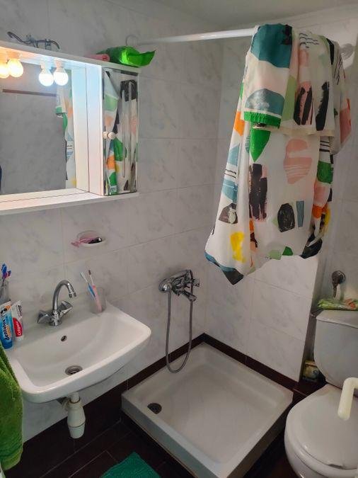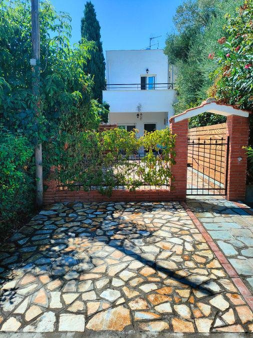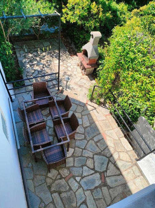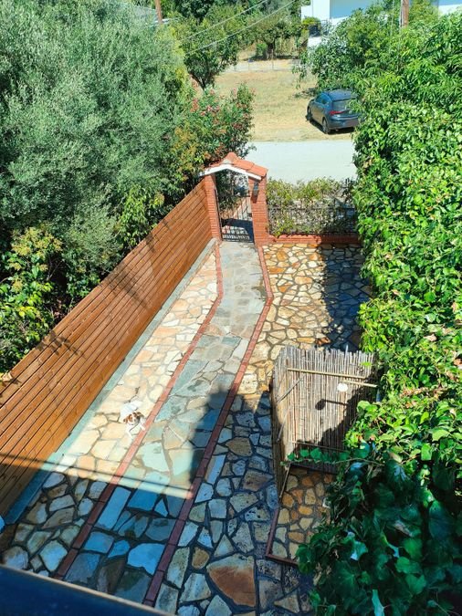 Additional features include double-glazed windows with shutters and insect screens, solar water heater, and strong roof insulation ensuring year-round comfort. The exterior areas are fully stone-paved, with a front-yard shower (hot and cold water), a two-level back yard with built-in barbecue, and a practical 15 m² storage room in the basement.