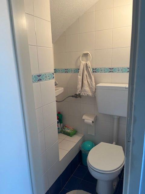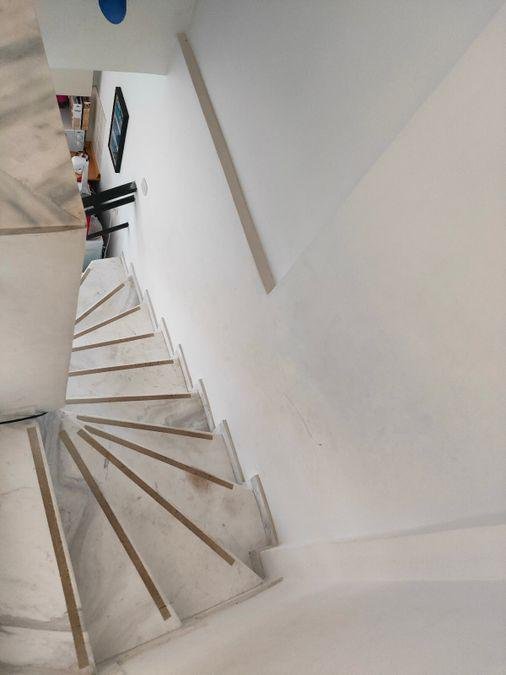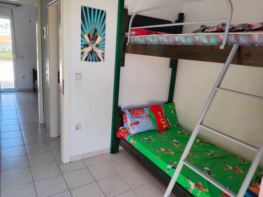 The ground floor (30 m²) features a spacious living room with a convertible sofa-bed, a fully fitted kitchen, a washing machine, and a small WC. Internal marble stairs lead to the upper floor (30 m²), where there are two bedrooms: one with a double bed and closet, and another with a closet and bunk beds. The upper level also includes a full bathroom with shower.