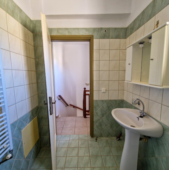 Upstairs, two double bedrooms with built-in wardrobes share a family bathroom with a bathtub and shower. Both bedrooms have direct access to a shared balcony offering breathtaking panoramic views of the sea, mountains, and countryside.