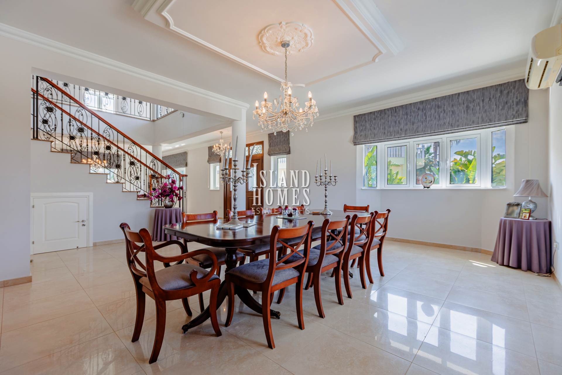 This is a unique opportunity to purchase a spectacular property in an incredible location, on the front line of one of the most inviting bays in the area. This property has an impressive exterior and an even more impressive outlook. The raised entrance porch is adorned with grand pillars, the double door entry leads into a splendid ground floor with a sprawling centrally positioned feature staircase. To the left of the stairs is a spacious kitchen and dining area. The large kitchen overlooks the pool and benefits from an island worktop with additional seating. The kitchen includes an eye level oven and microwave and is finished in a dark wood and striking black worktop and splashback.
