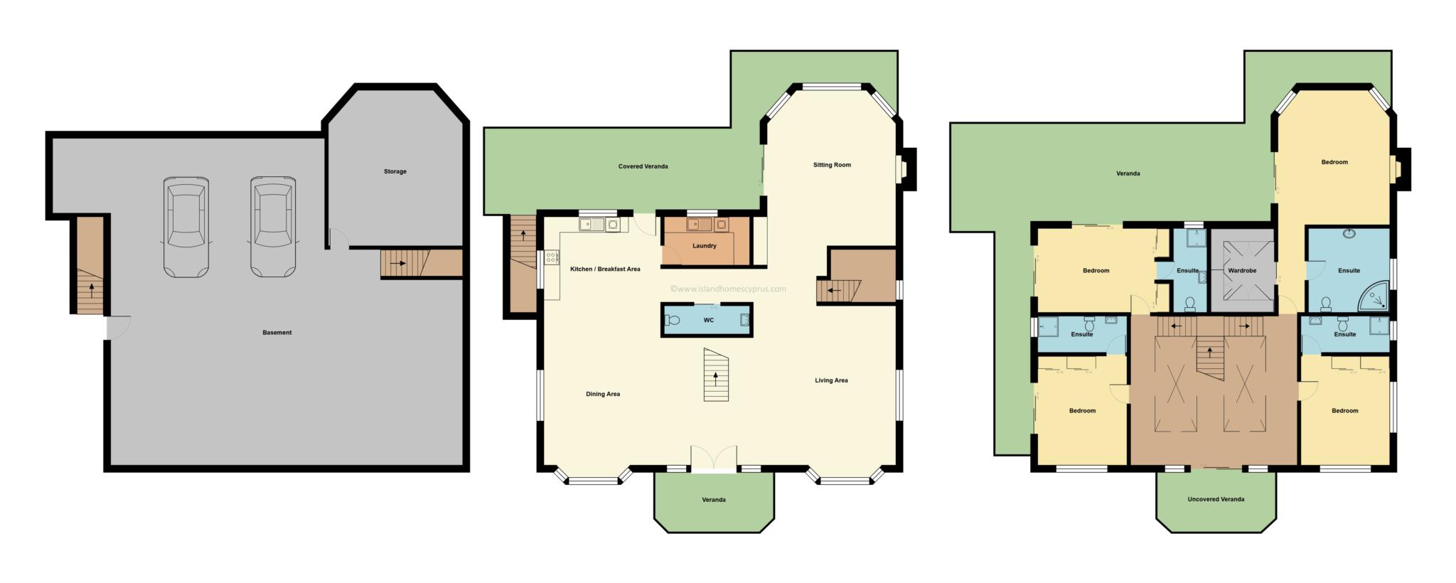 Moving on, the bifurcated, statement staircase, to the first floor greets you with an open and bright landing space which gives full wraparound view of the property and benefits from doors to access the veranda above the front porch. On the first floor you will find the master bedroom which boasts a private, 4 piece, ensuite bathroom with corner bath, separate shower, WC and sink with spacious vanity unit. The master bedroom and bedroom two (en-suite also), both have a prime position in the house with both rooms including two sets of patio doors leading to the large veranda. Both of these bedrooms and their adjacent veranda offer breath taking panoramic sea views which must be seen to be fully appreciated. Bedroom three and four, also spacious, include separate shower rooms. Three bedrooms benefit from fully integrated floor to ceiling wardrobes with the master bedroom boasting a walk in wardrobe.