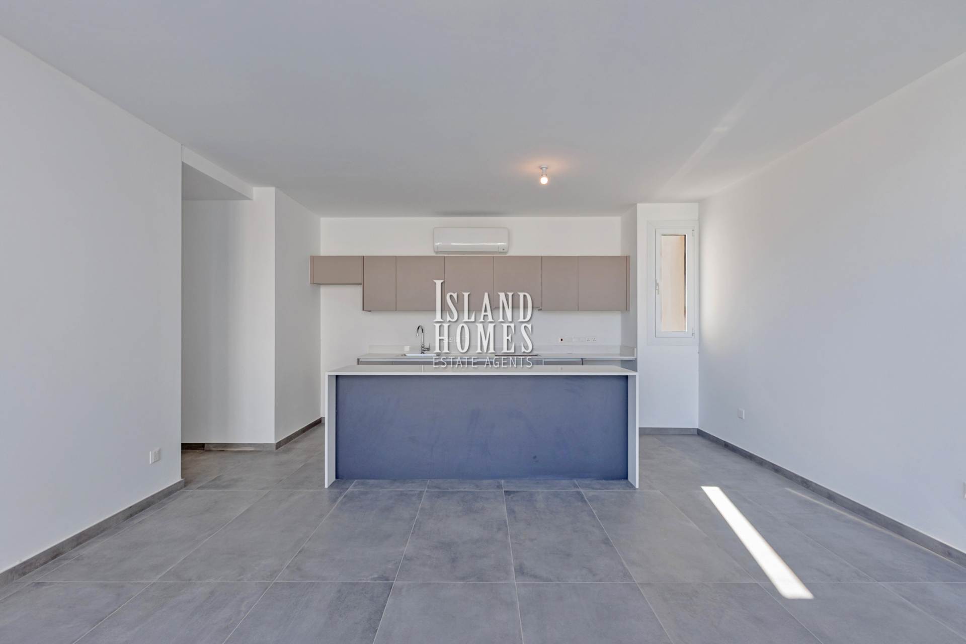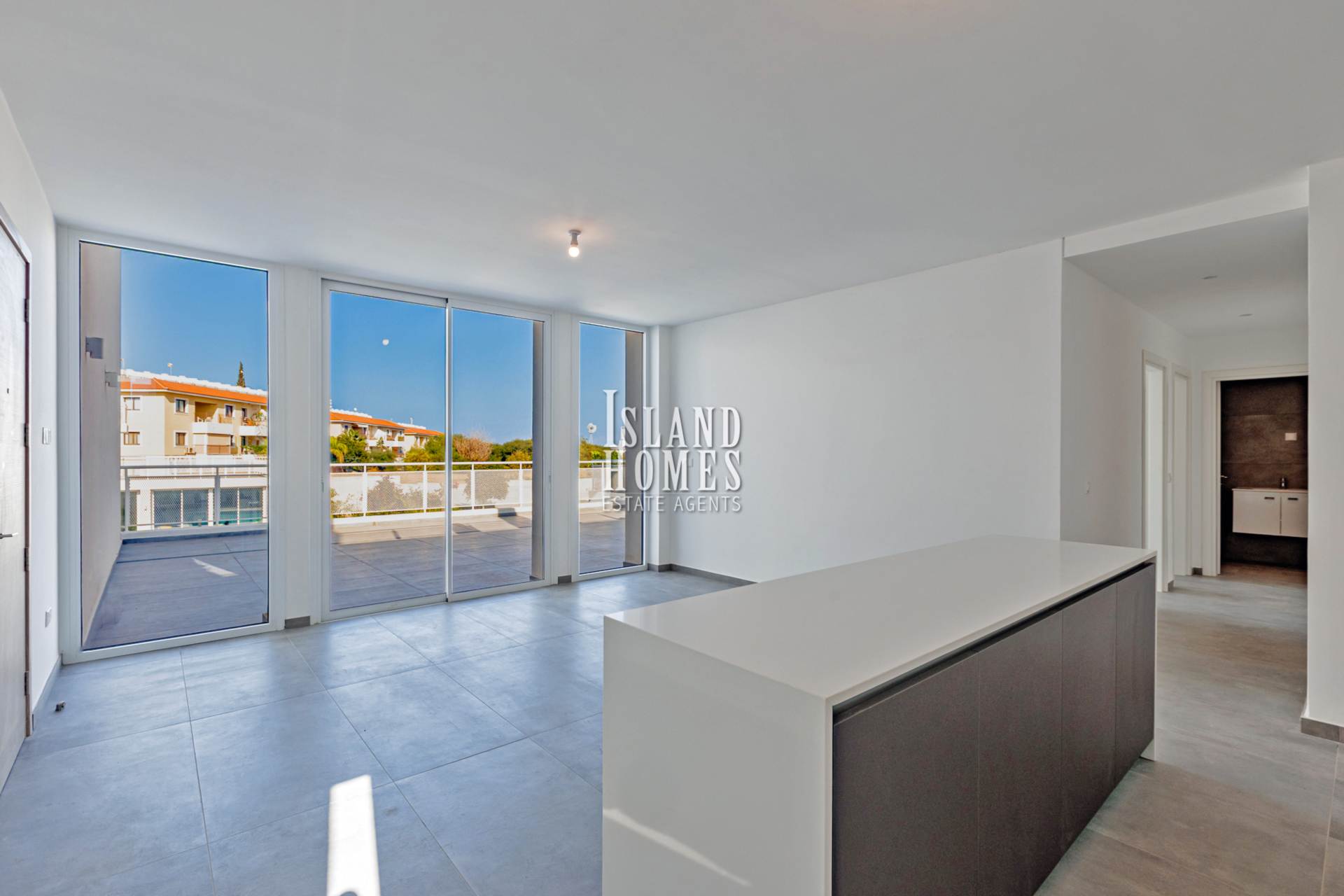 This first floor apartment is offered for sale unfurnished, a great blank canvas ready to create the property of your dreams. The apartment has an open plan design, consisting of kitchen, dining and living area. The kitchen offers a large breakfast bar and the living area is full of natural light, thanks to the floor to ceiling and wall to wall patio doors which access the spacious terrace. There is a short corridor leading to the guest shower room, main bathroom and both bedrooms. The bedrooms include built in wardrobes and offer plenty of natural light from the patio doors which access the veranda.