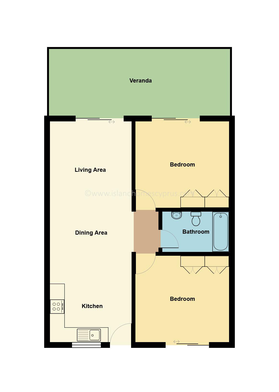 The apartment features two bedrooms, both double in size and each one includes built in wardrobes providing ample space for family, guests, or a home office. Bedroom one also benefits from patio door access to the veranda shared with the living area. The bathroom is modern and thoughtfully designed in neutral tones, featuring bathtub, over bath shower, WC and sink with handy vanity unit.