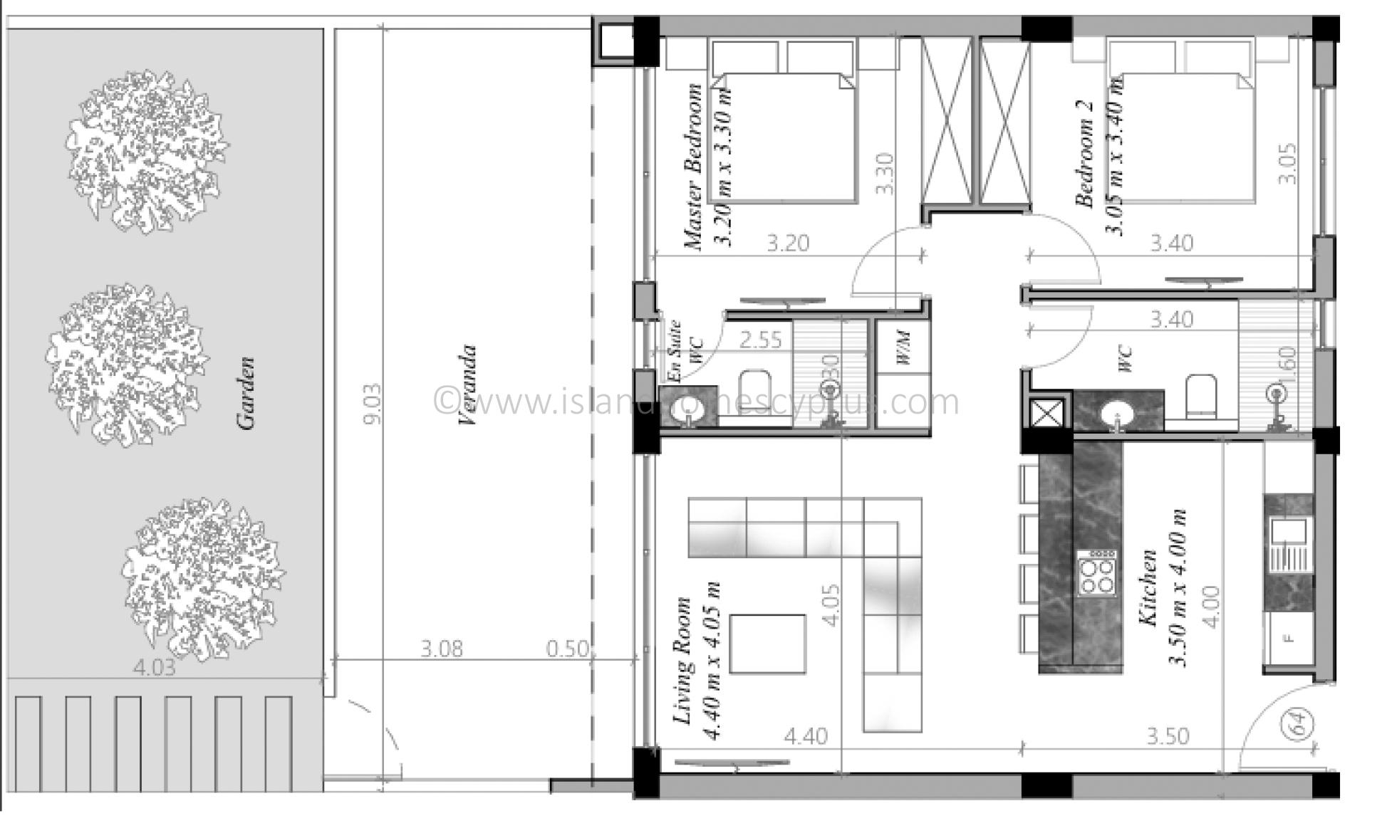 This 2 bedroom apartment is on the ground floor with a 68m2 garden, open plan kitchen, dining a living area, 2 double bedrooms with en suite and a separate lockable store.