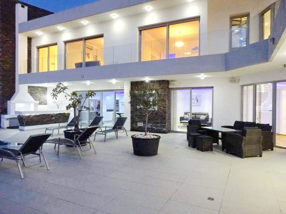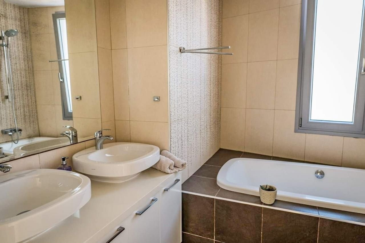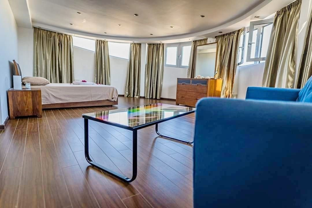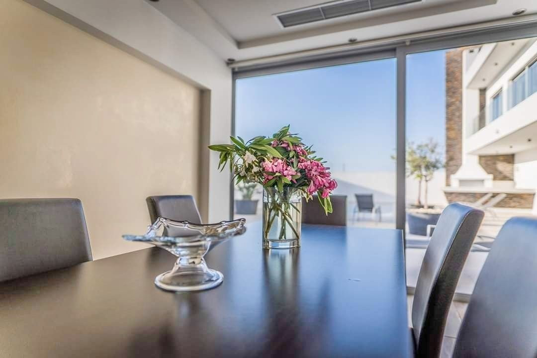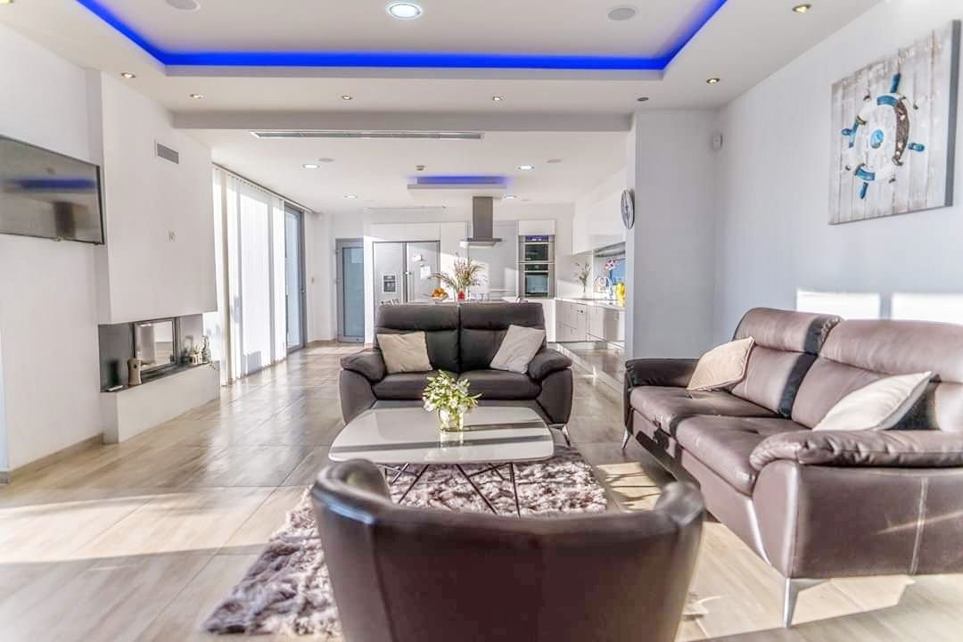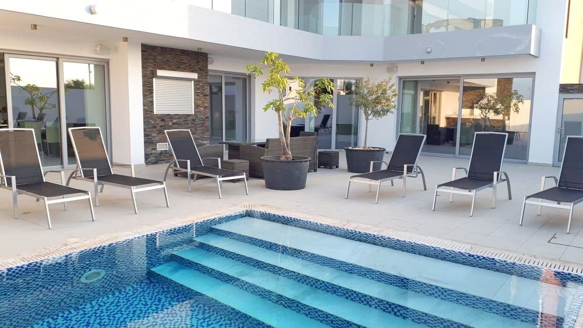 Four bedroom unique luxury villa for rent with panoramic view of the sea (range 1km) and the town of Larnaca (range 2km) is located in a very unique spot at Livadia, Larnaca. Livadia is, north of Larnaca, approximately 10 minutes drive to the centre of Larnaca, with only 2 minutes away from the Larnaca - Nicosia highway and approx. 5 minutes drive to the beach and the Dekhelia road, close to dining, entertaining, schools, supermarkets, bakeries and everything you need for the daily use and all other amenities of the tourist area. With easy access to the main traffic routes. An ideal location for holiday and residential homes.