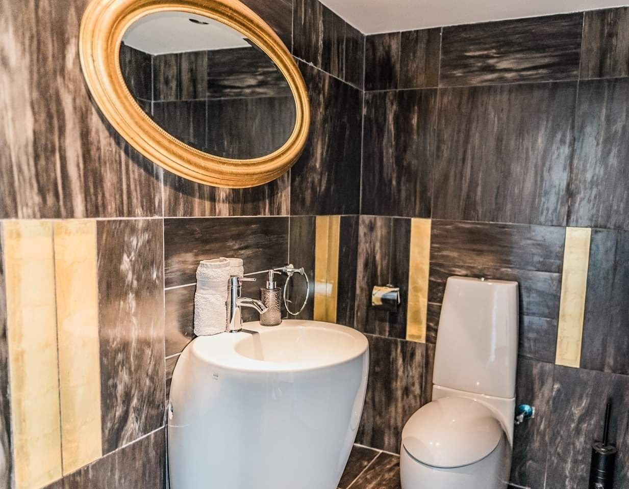 The modern and luxurious home consists of a ground floor which is open plan with a large kitchen and a living room with fireplace. There is also a dining and lounge area with a guest w.c.