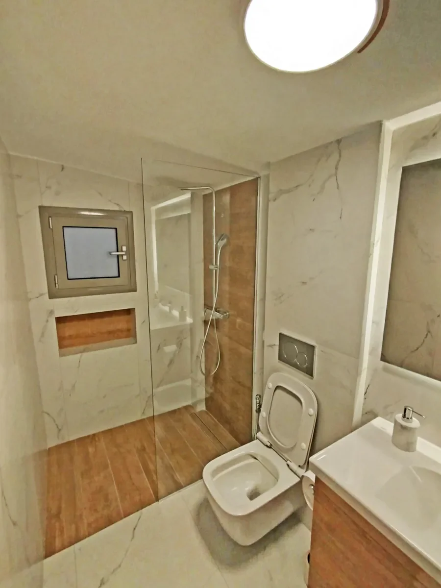 A luxurious 70 sq.m. loft on two levels (5th and 6th floor) in a newly built (2024) minimalist-style construction, featuring exposed concrete surfaces, glass, and industrial red textures.