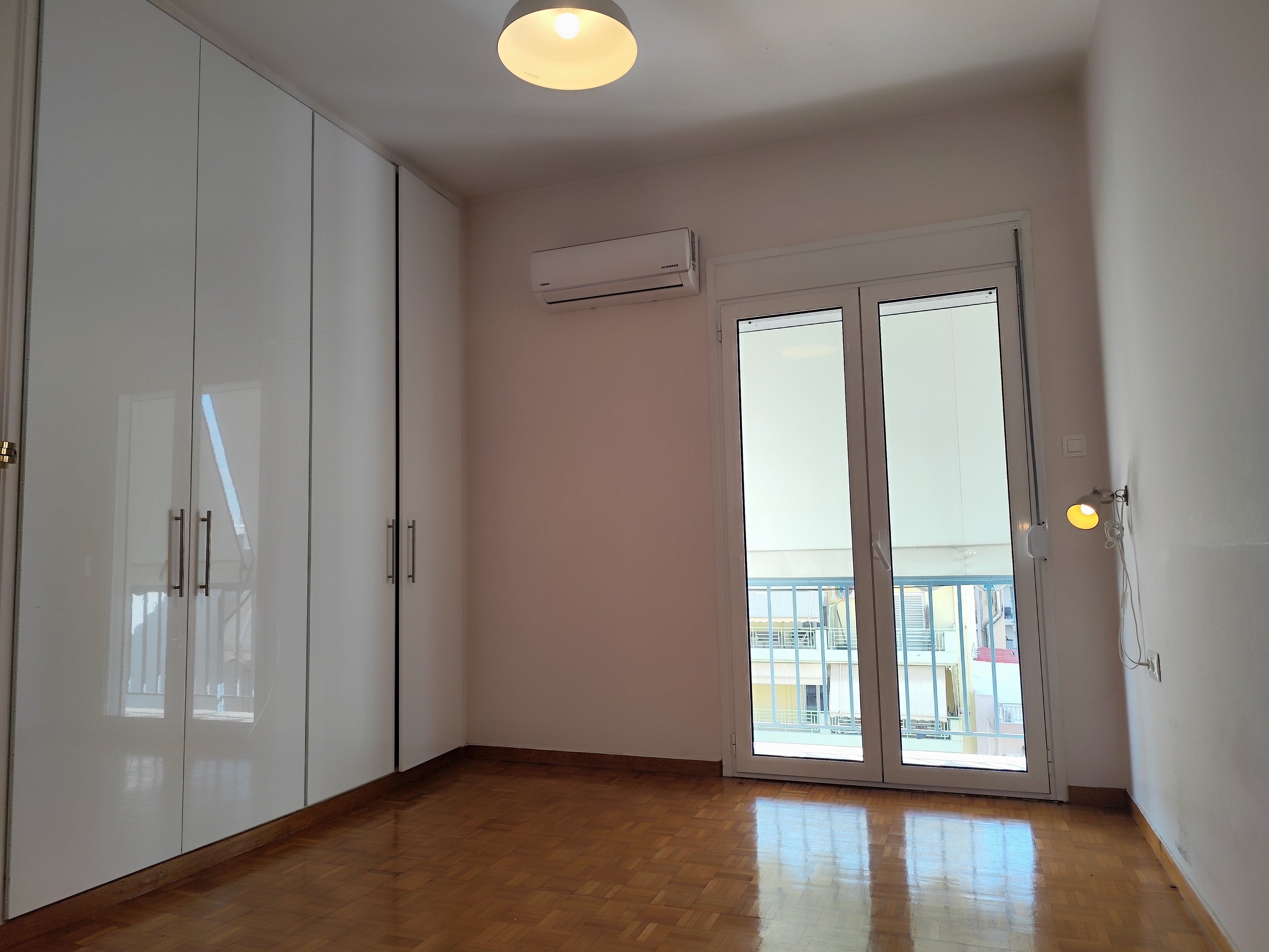The apartment features a bright living area with a contemporary layout, two well-proportioned bedrooms, and a modern kitchen equipped with electrical appliances. Each bedroom is fitted with its own air-conditioning unit, ensuring year-round comfort and energy efficiency.