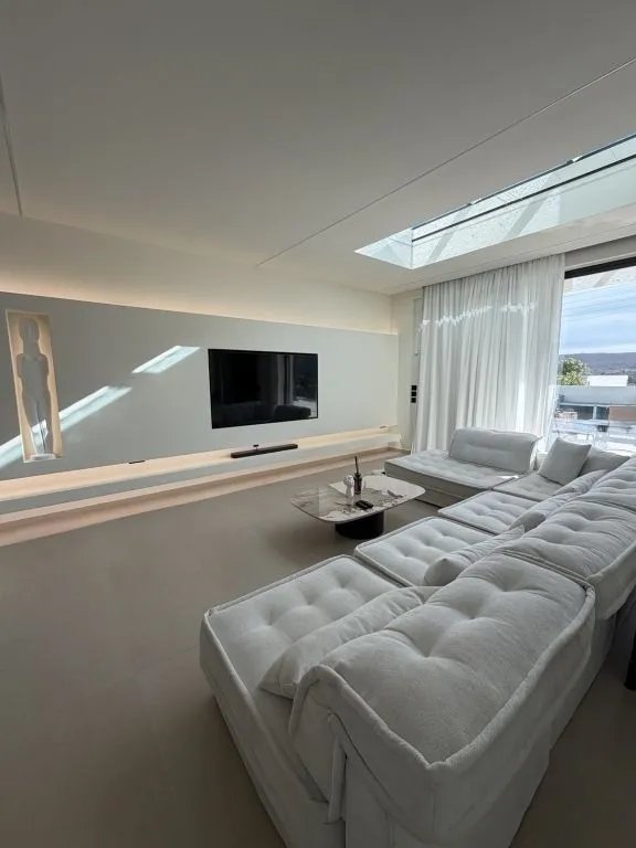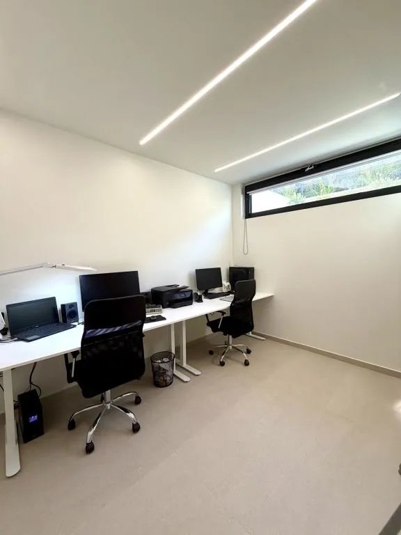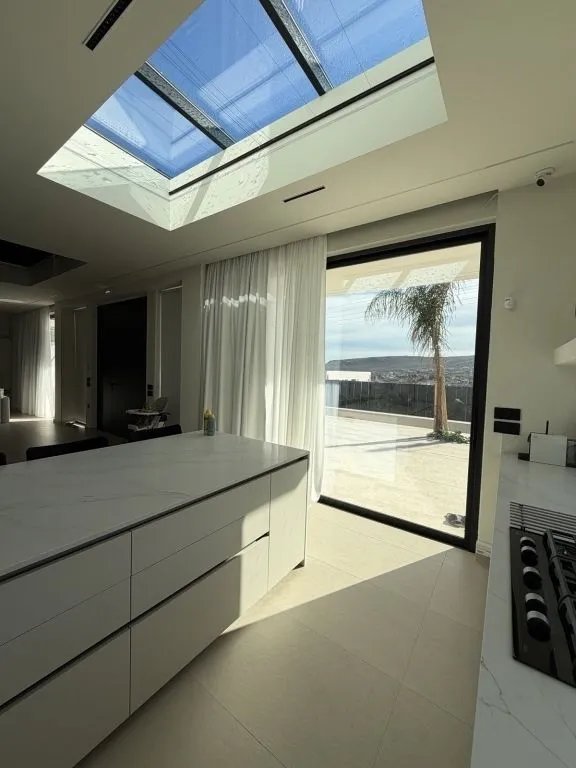 The villa is surrounded by a landscaped garden with lawn and palm trees, while a 75 sq.m. garage is located at the rear. Additional features include elevator, internal staircase, heat pump, solar water heater, light wells, security system, fireplace, and energy efficiency class A+. A luxurious, bright, and airy residence offering an exceptional living experience with immediate access to the amenities of Heraklion.