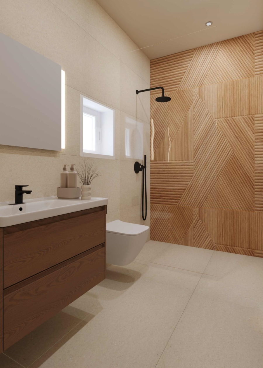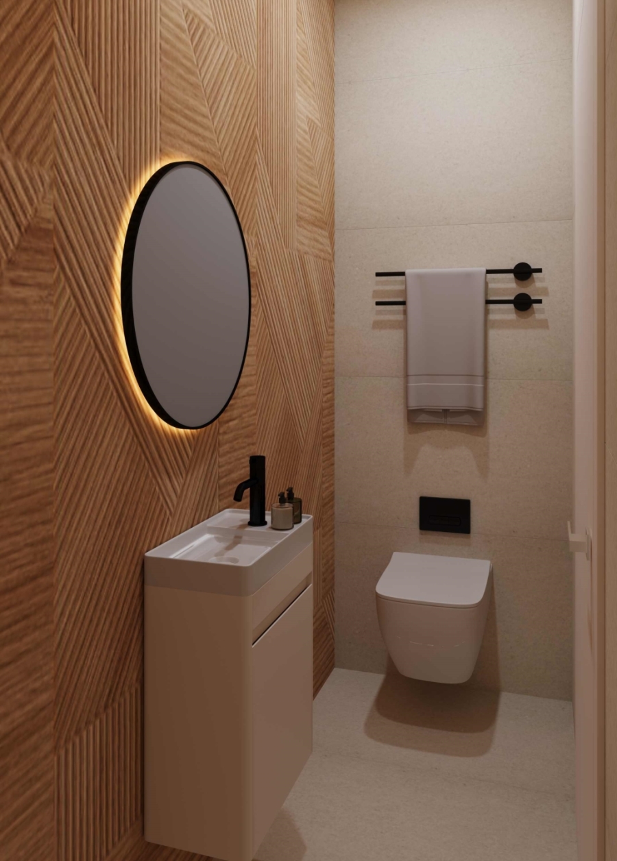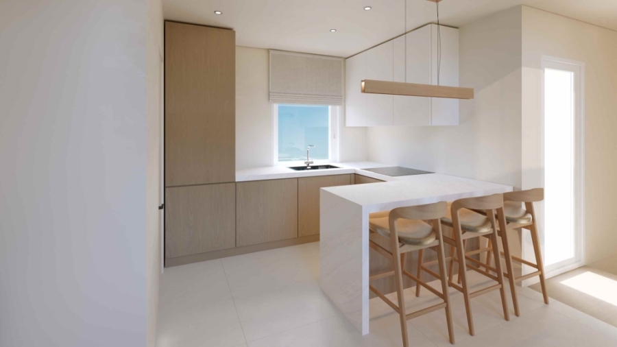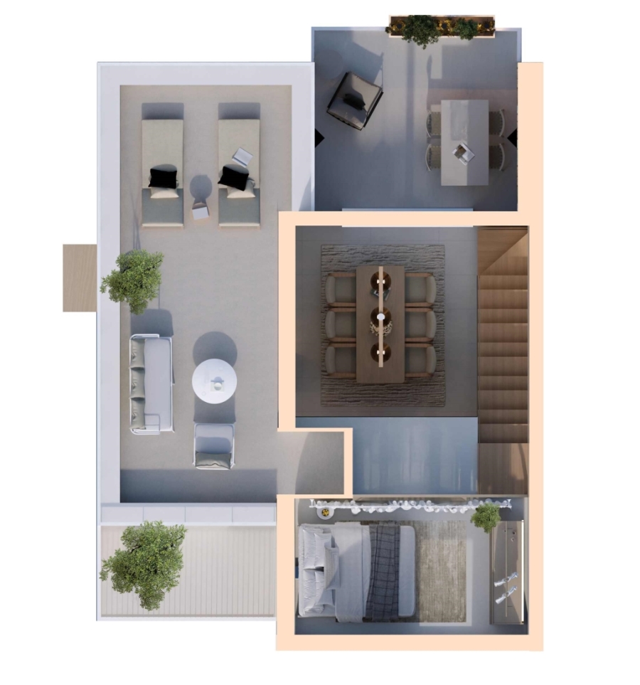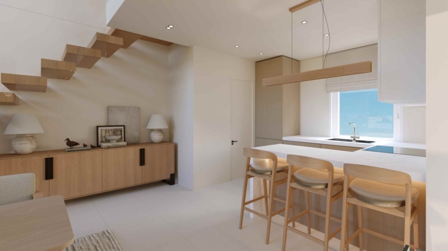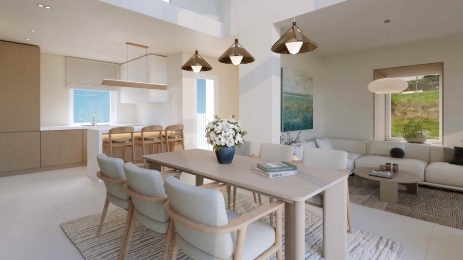 The upper floor hosts a contemporary open-plan layout that includes the kitchen, dining, and living spaces, along with a convenient guest WC. Large sliding doors open to a serene terrace, creating a seamless extension of the living area outdoors.