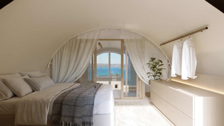 Above, a mezzanine level leads to a spacious rooftop terrace with open views across the surrounding landscape-a perfect setting for sunset cocktails, quiet mornings, or enjoying the night sky over Crete.