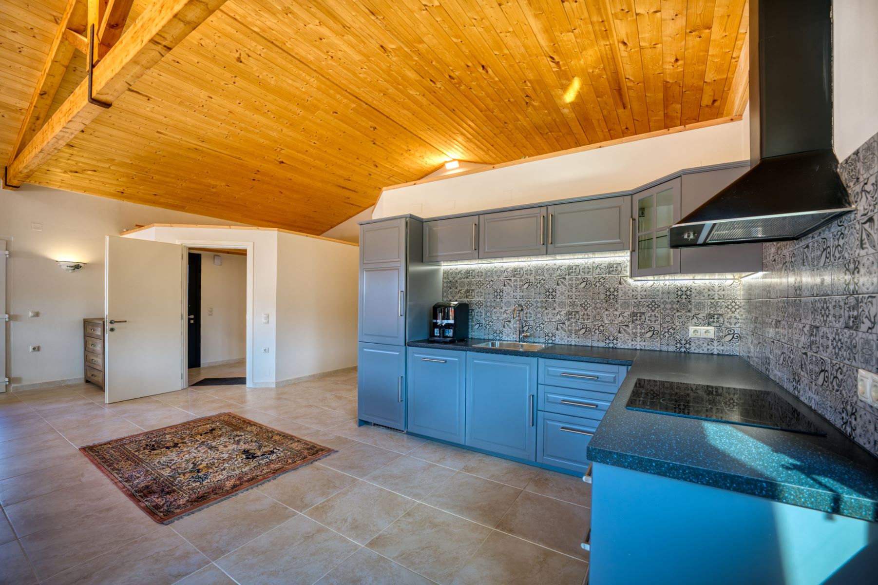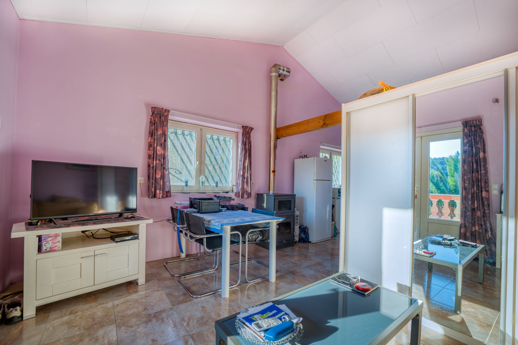 *The large apartment (15mx8m) includes a comfortable hall with w.c and wardrobe and then in a large single space kitchen, living room and dining room with fireplace with beautiful wooden beams and high ceiling.
