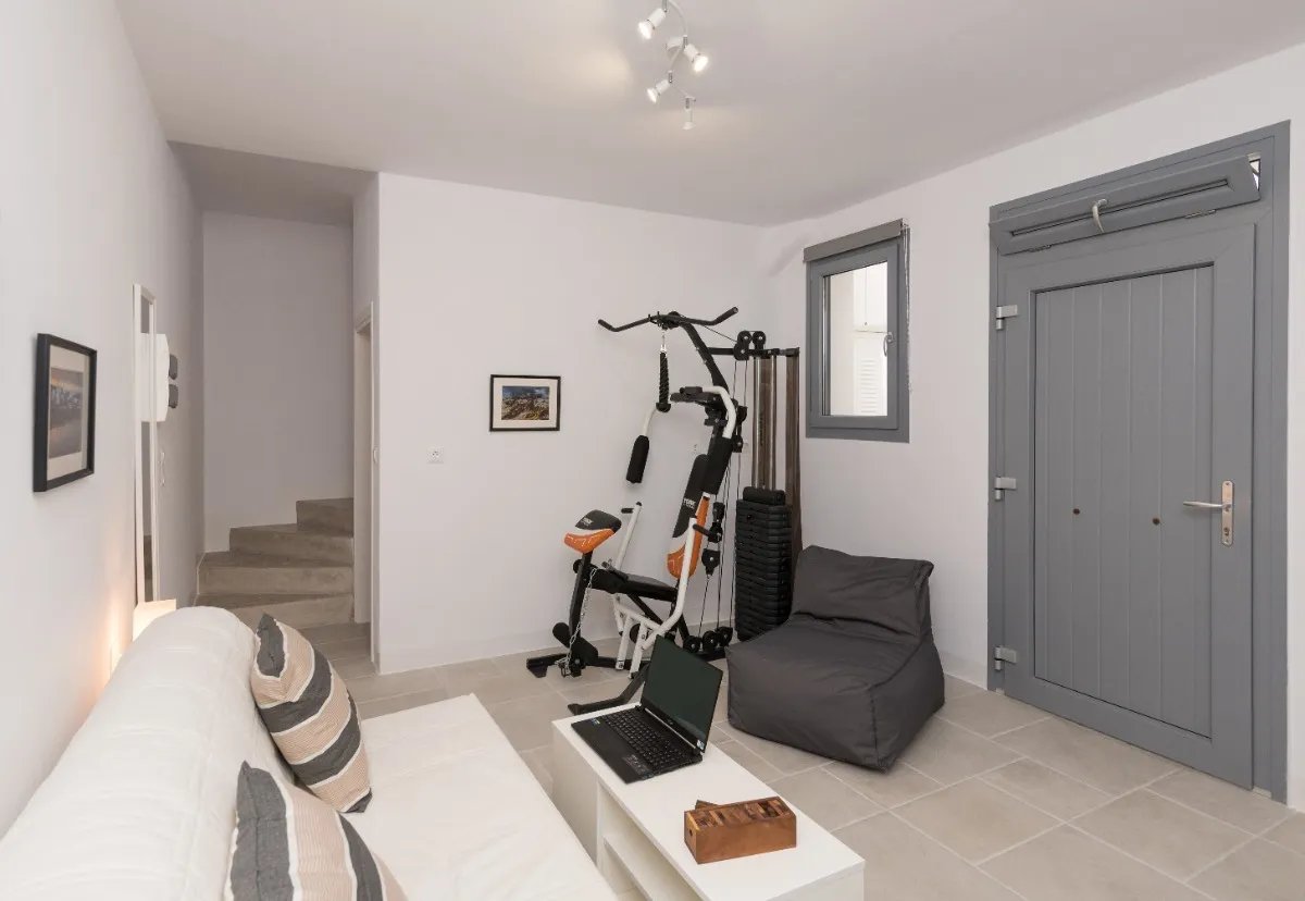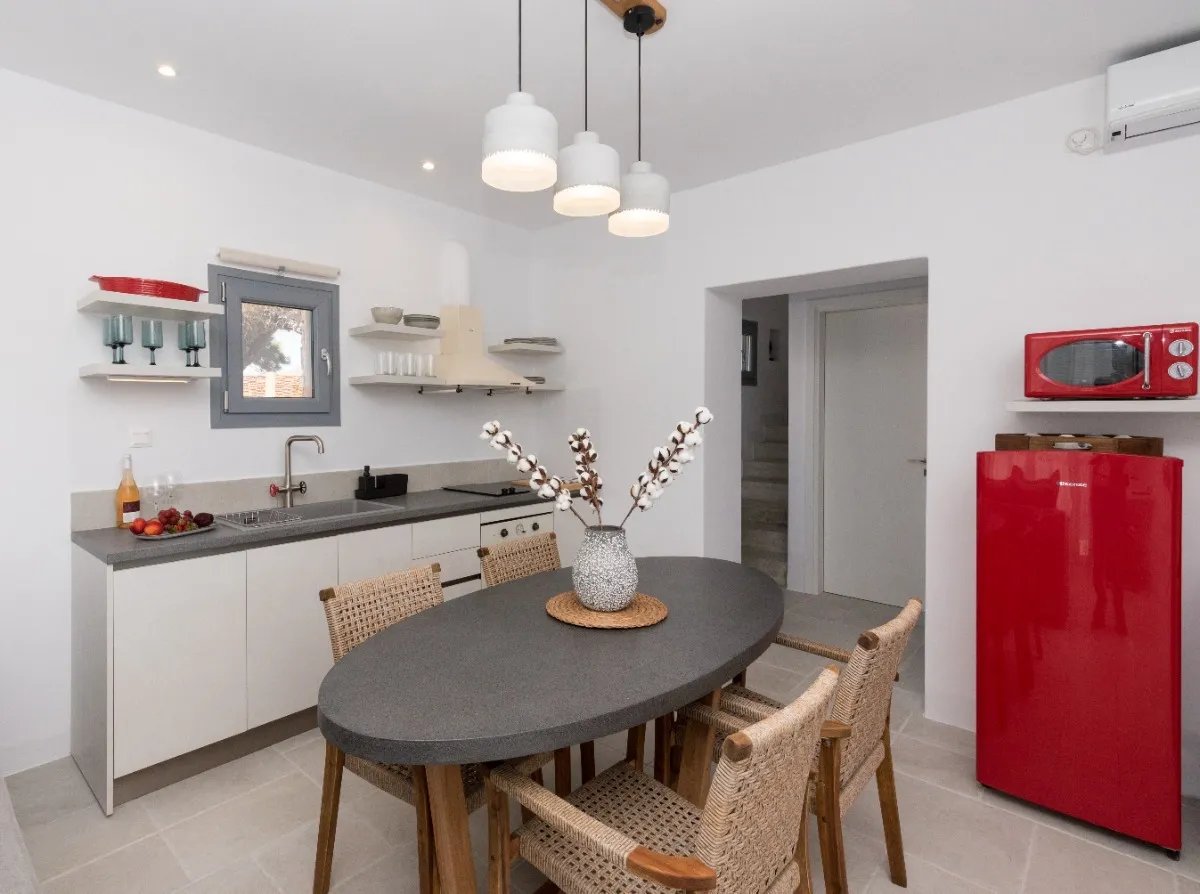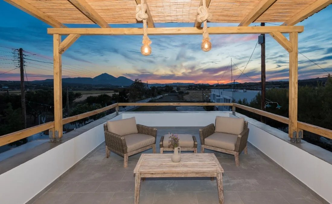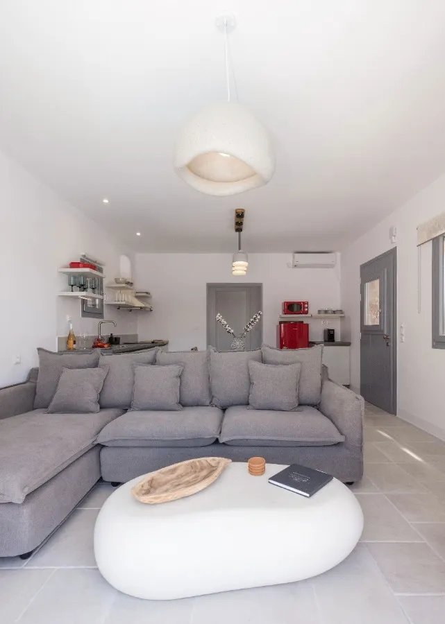 The maisonette's orientation and design ensure natural ventilation and plenty of light throughout the day, while the use of natural materials and minimalist décor enhances the feeling of peace and authenticity.