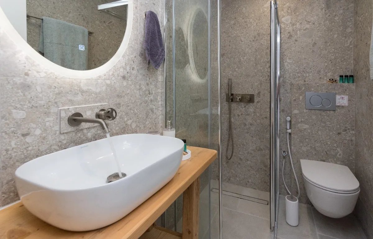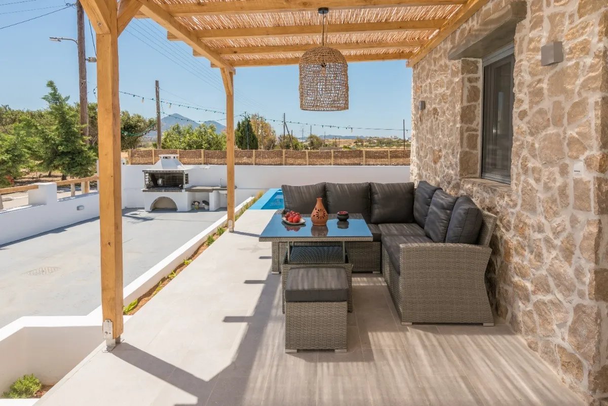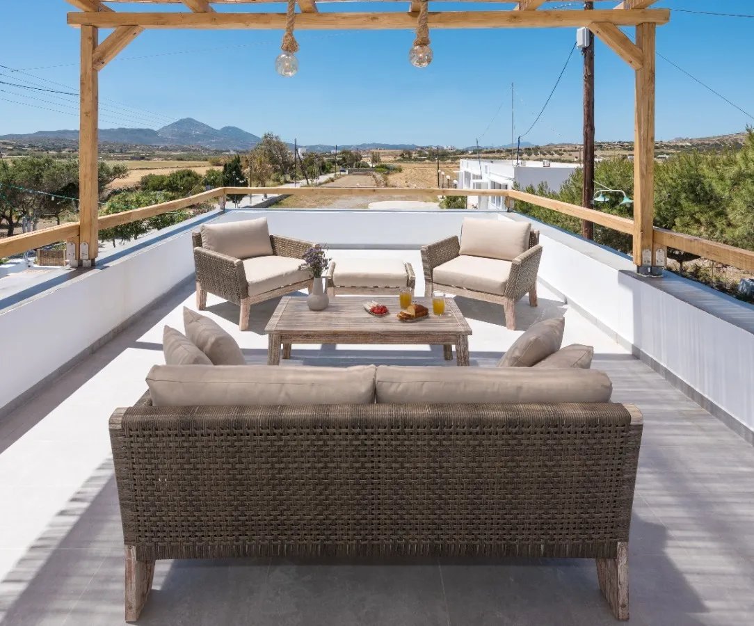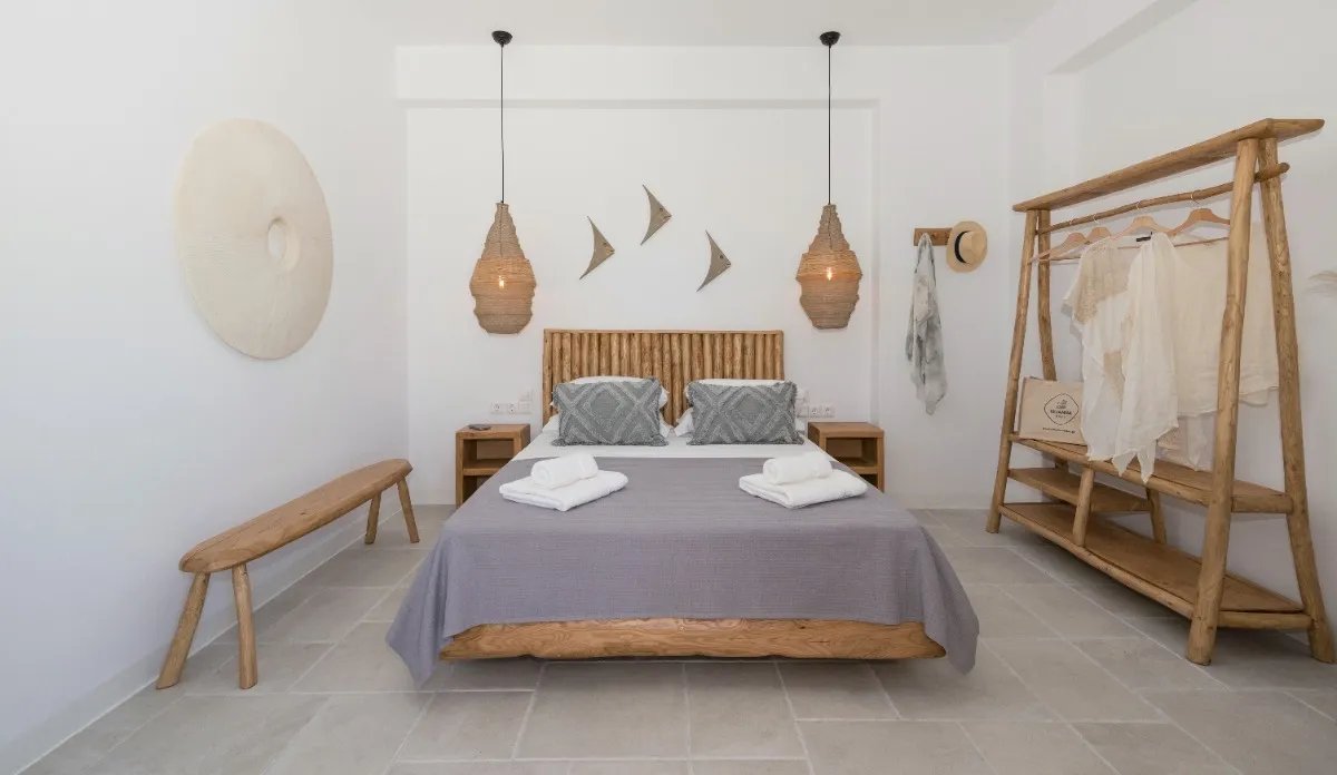 The maisonette's orientation and design ensure natural ventilation and plenty of light throughout the day, while the use of natural materials and minimalist décor enhances the feeling of peace and authenticity.