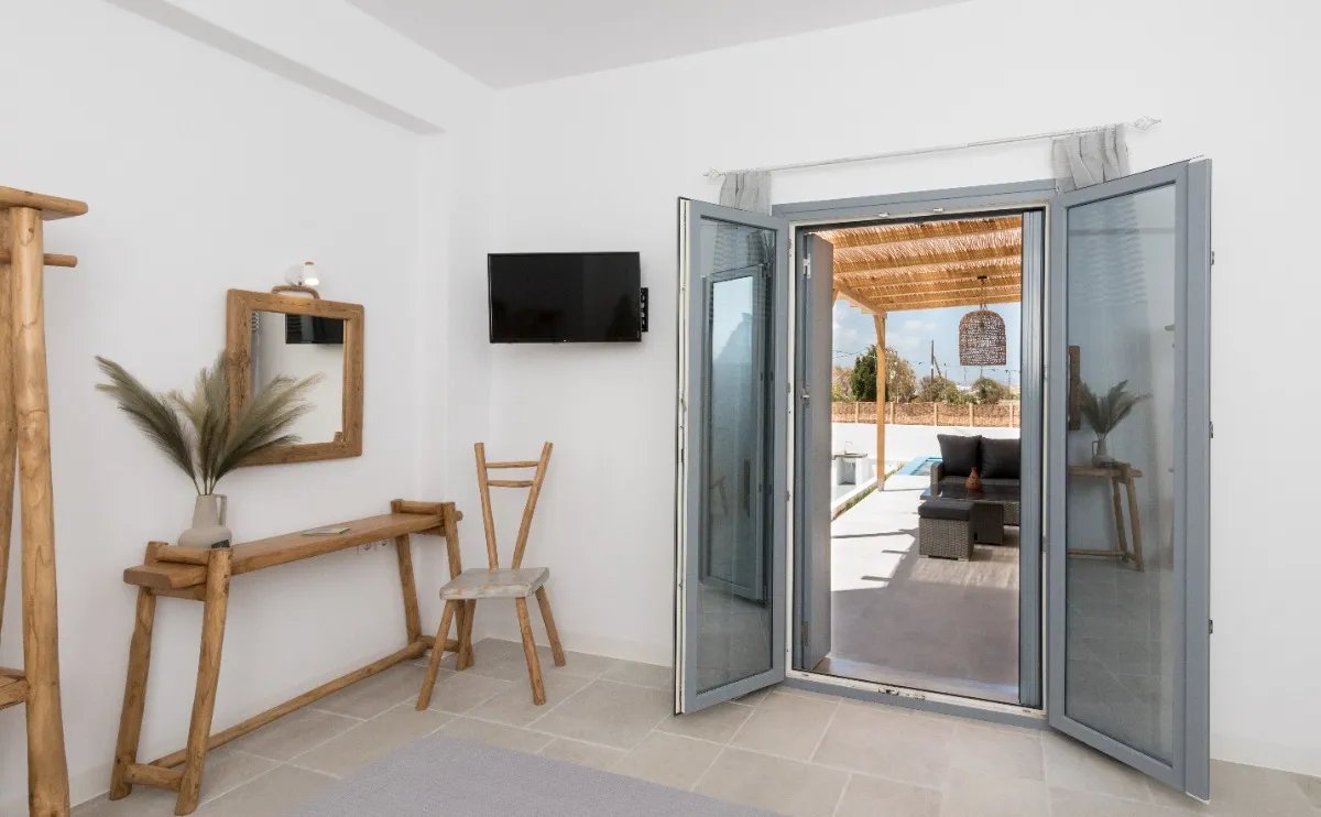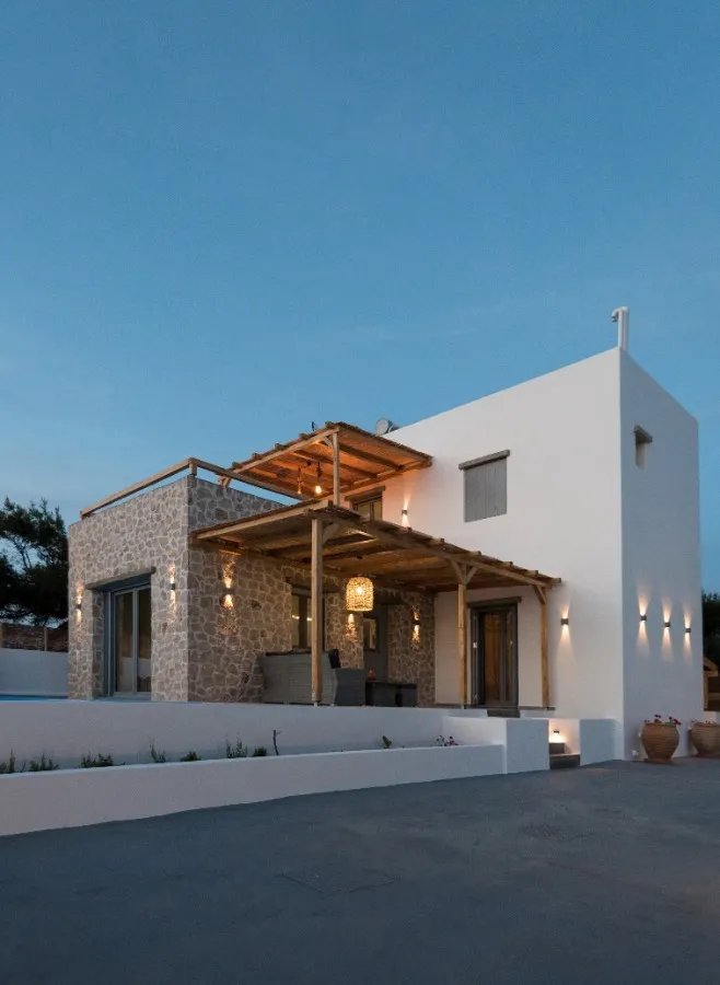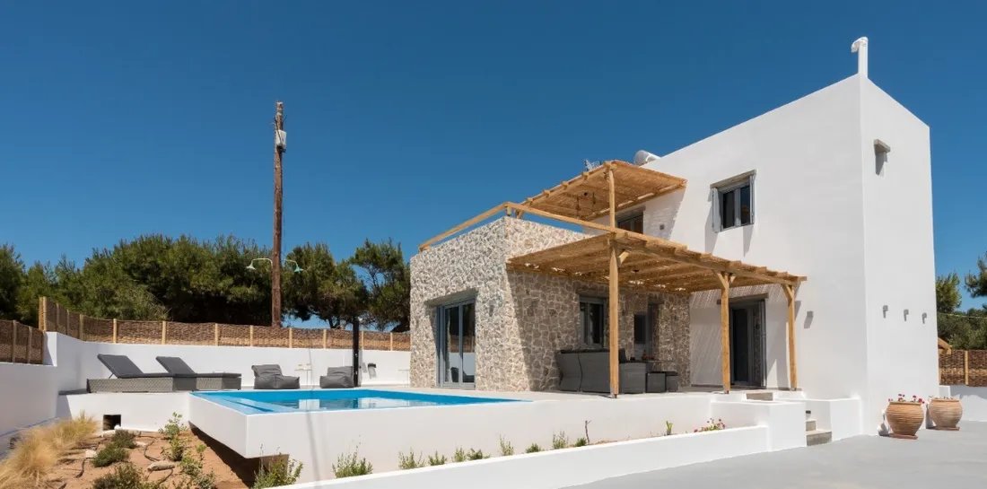 The interior features open, sun-filled spaces with a modern aesthetic and a relaxed island atmosphere. Large windows and sliding doors allow for seamless indoor-outdoor living and frame captivating views of the Aegean Sea and surrounding mountains. The main living area opens onto a spacious terrace with a private pool and pergola, creating an inviting setting for relaxation or entertaining guests while enjoying the panoramic views.