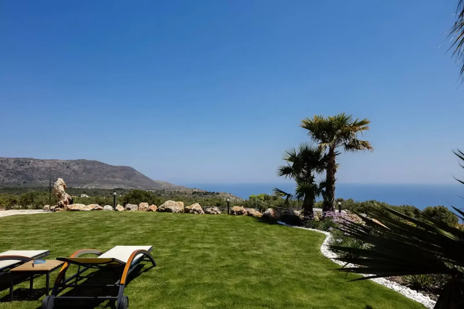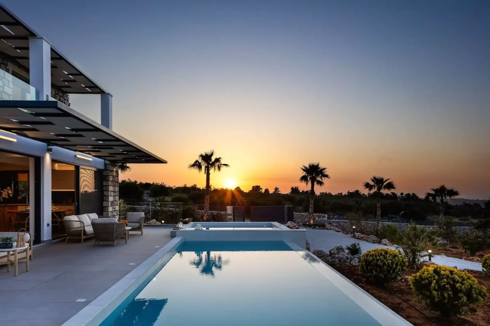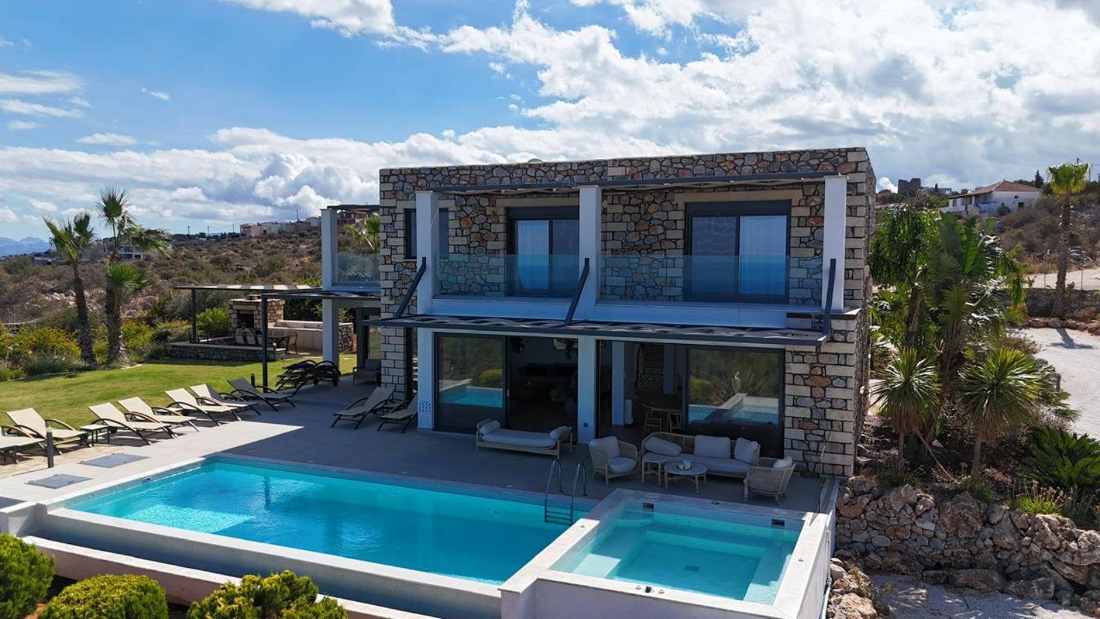 A stunning infinity pool overlooks the Aegean Sea, complemented by a built-in jacuzzi, expansive terraces, and lush landscaped gardens. The setting offers serenity and understated luxury, perfect for enjoying the Cretan sun or tranquil evenings under the stars.