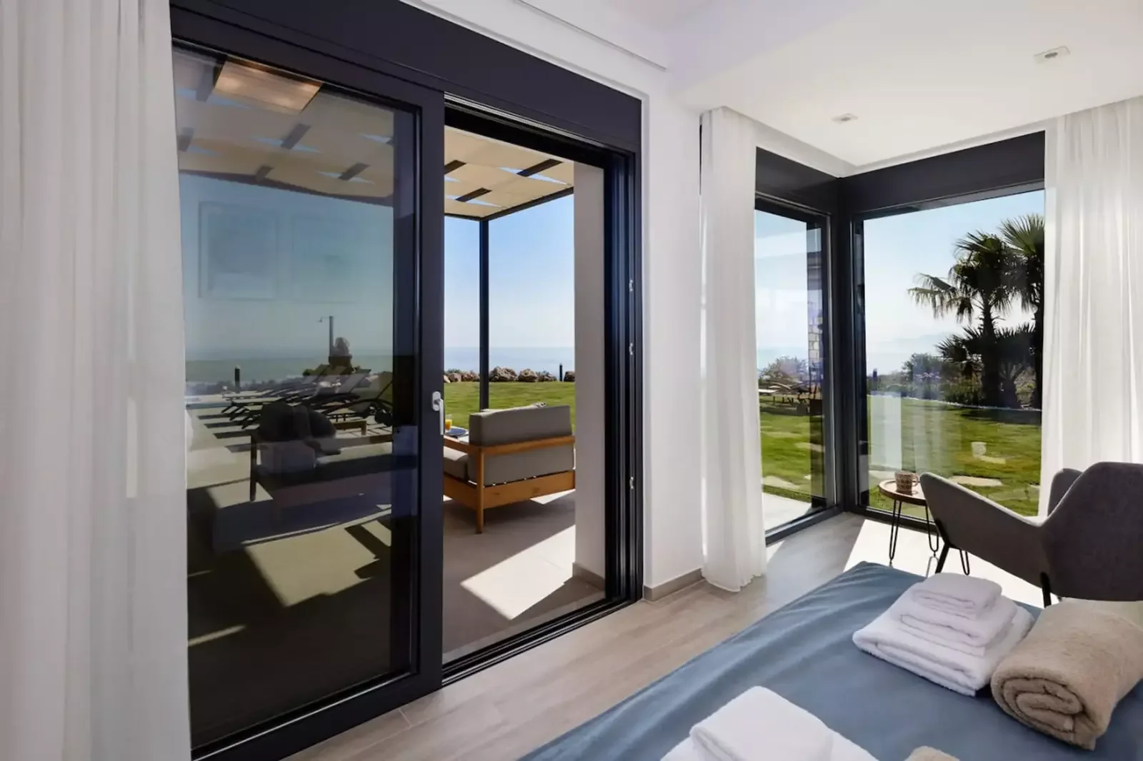 Bright open-plan living and dining area with panoramic sea views