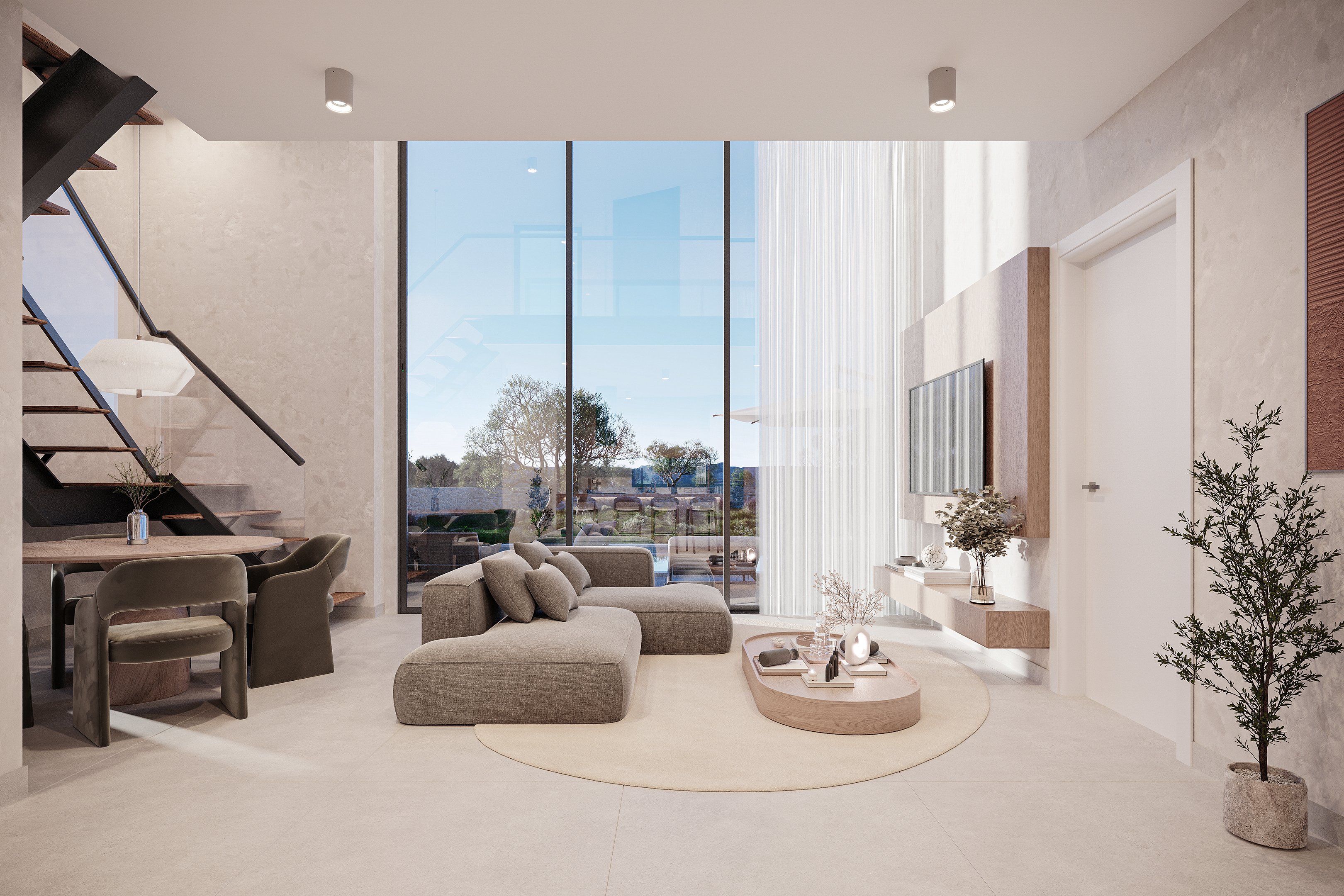 Outdoor dining and lounge spaces surrounded by olive trees