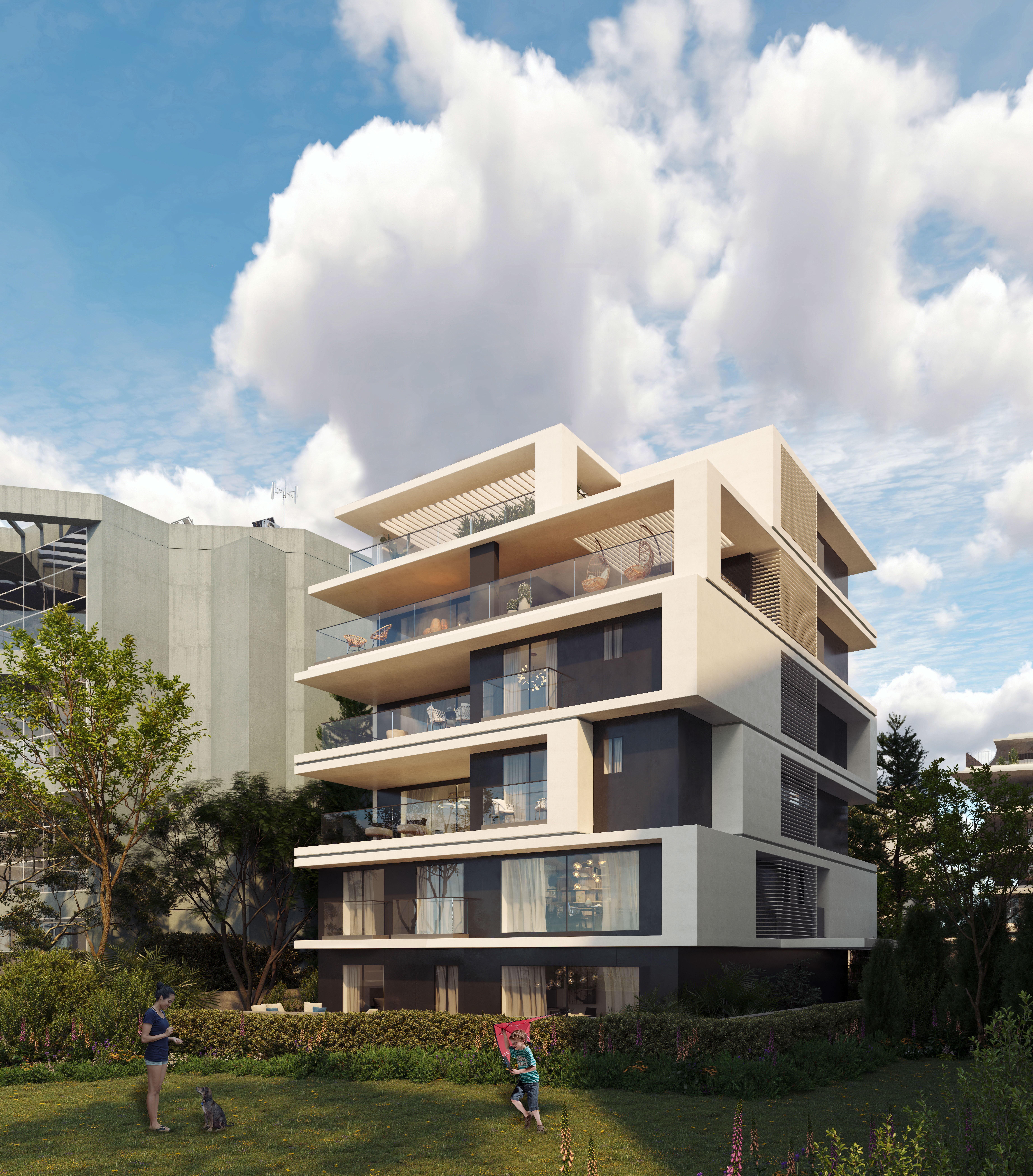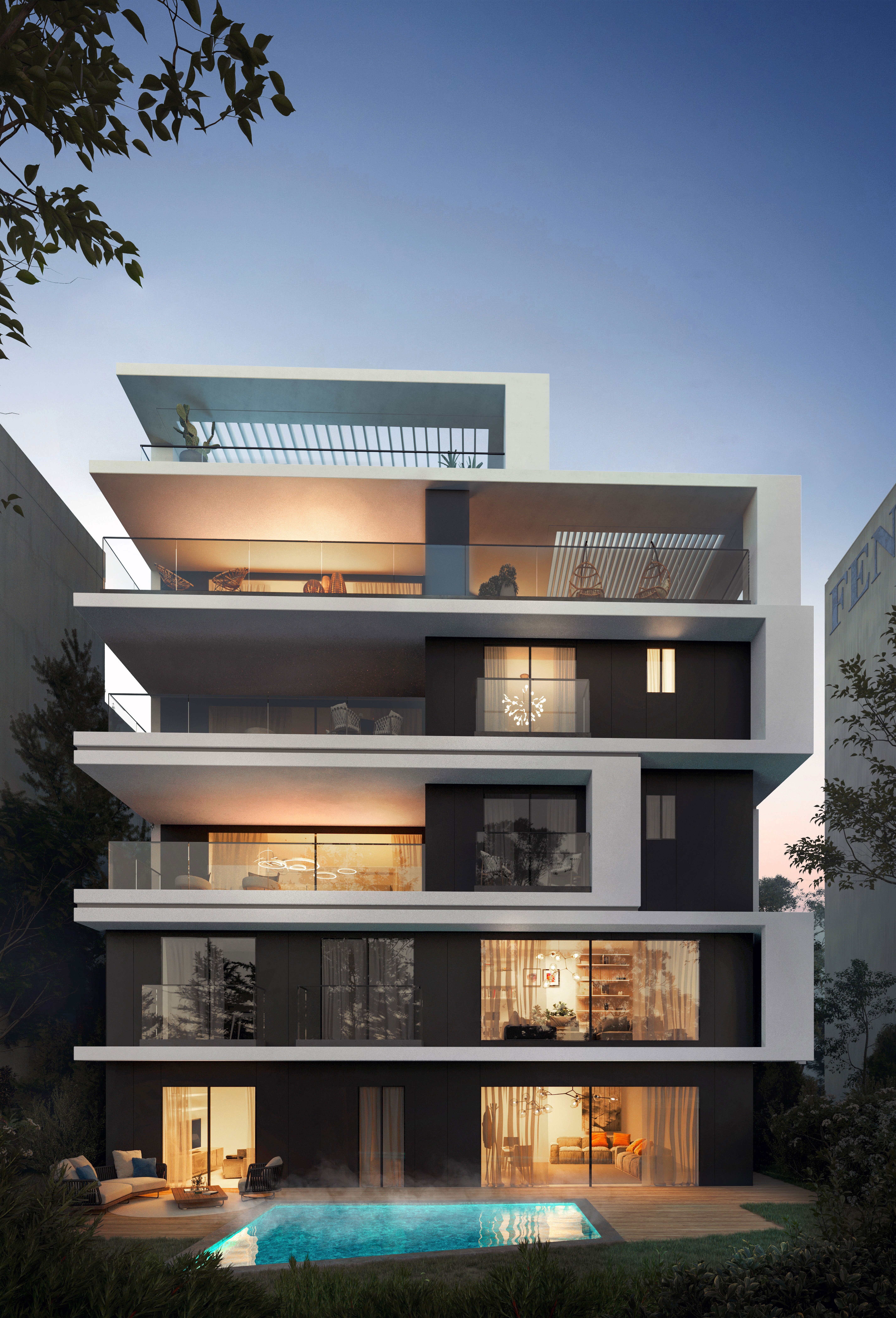 The five-story building includes only five exclusive residences, spacious floor apartments and refined duplexes, each featuring private swimming pools, covered parking, and exclusive use of garden or rooftop areas.