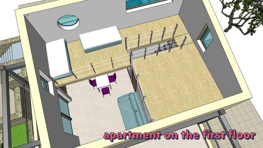 Ground Floor Apartment: Living room with open kitchen, bedroom, small additional room, bathroom, and storage room.