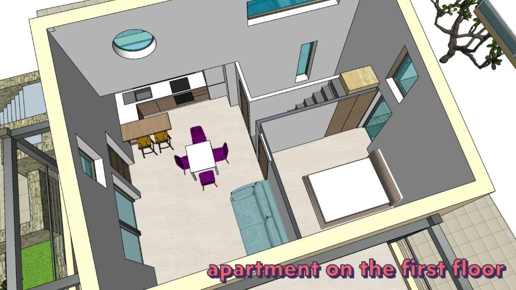 First Floor Apartment: Living room with open kitchen, bedroom, bathroom, a beautiful sea-view terrace, and a functional attic.