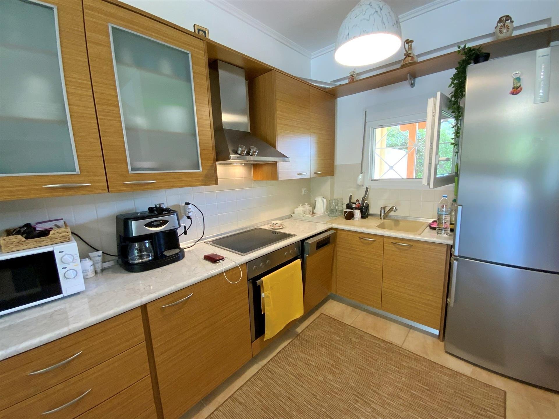 On the ground floor, there is a spacious living room with a fireplace, a sitting area, and a kitchen with built-in furniture and all electrical appliances, as well as a guest W.C.