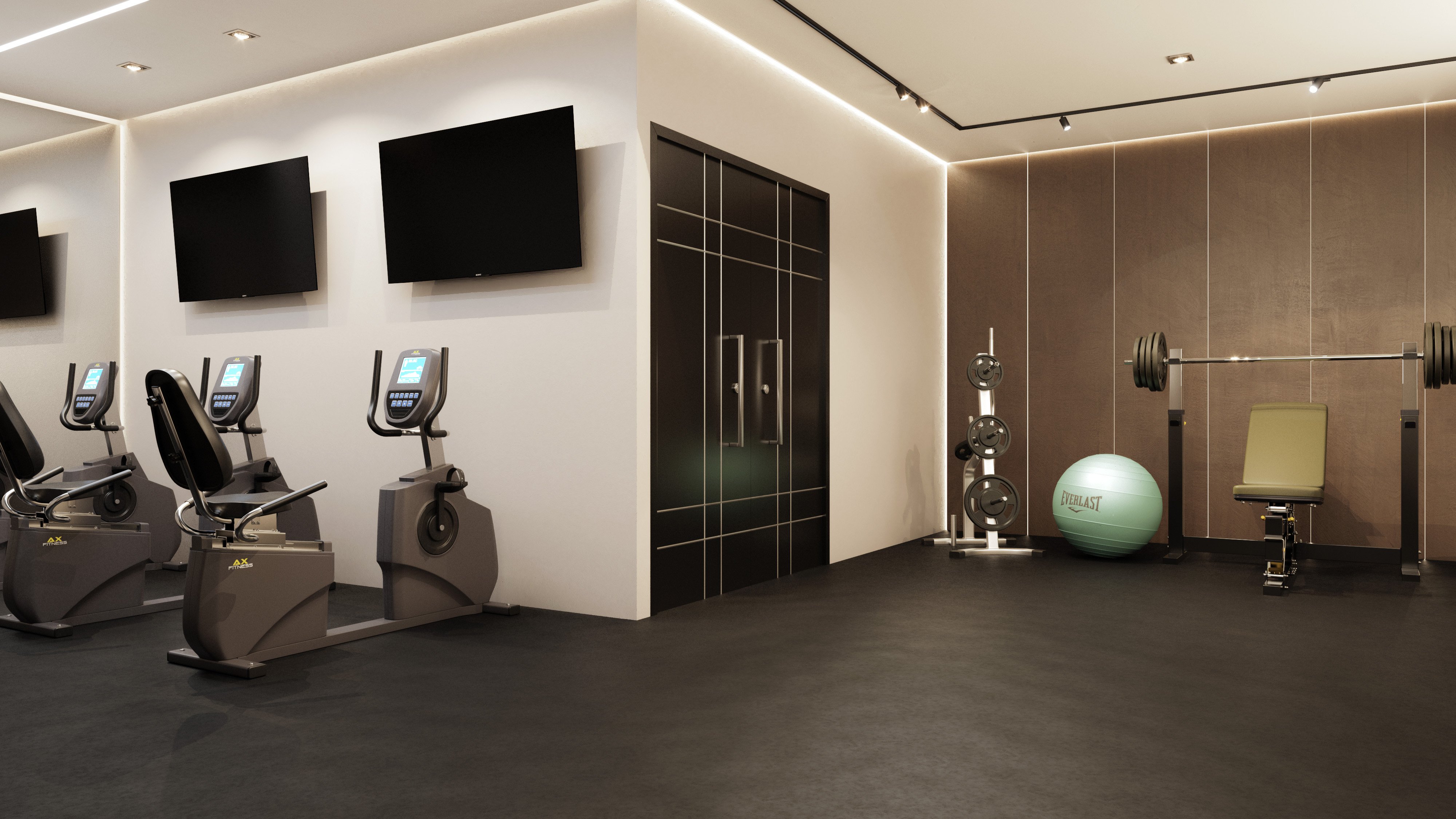 On-site amenities including a rooftop lounge with Acropolis views, gym, sauna, and co-working space