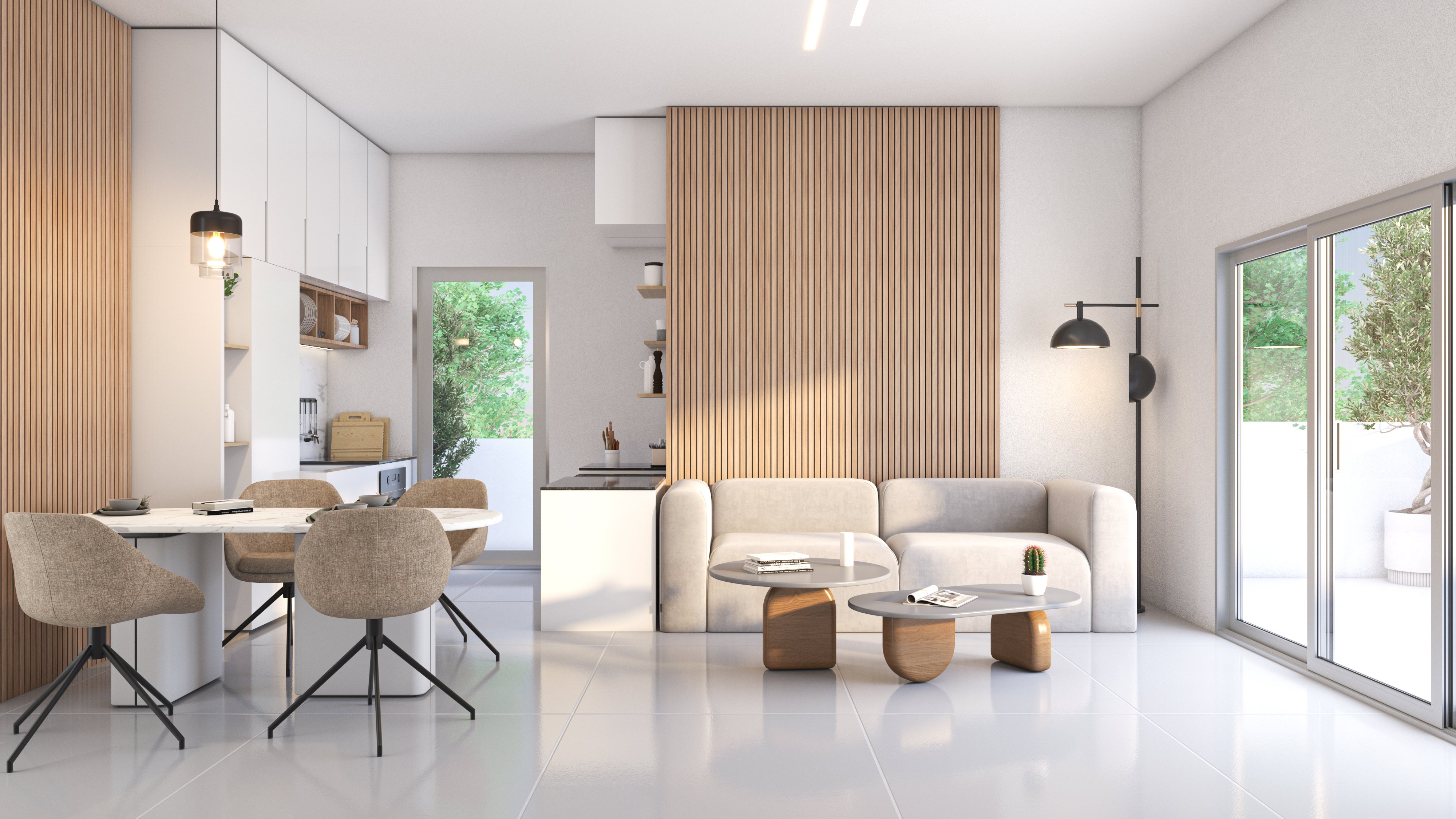 The apartment features bright, airy interiors, an open-plan living area, and spacious balconies that extend the living space and invite outdoor relaxation.