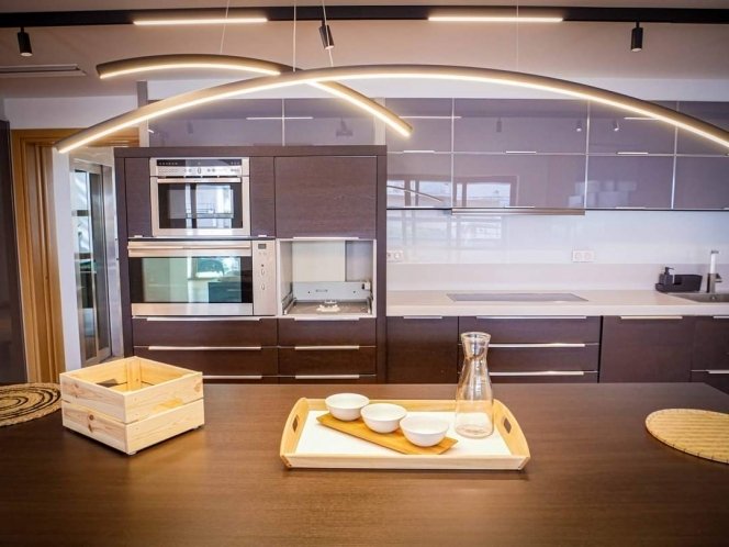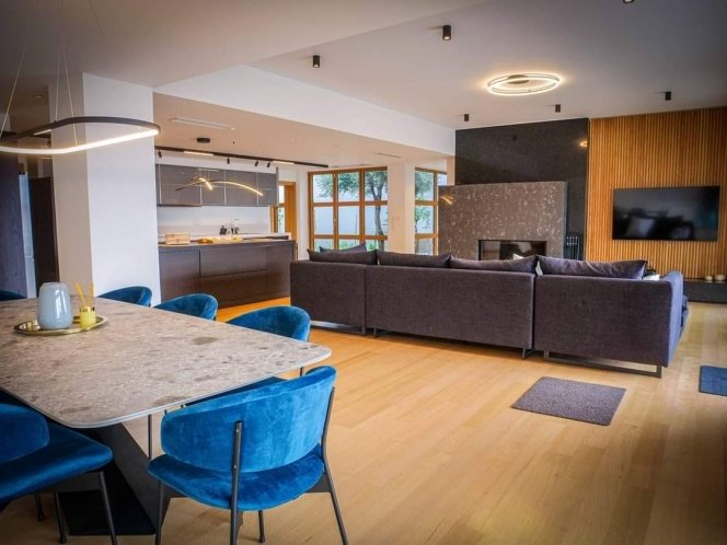 As you enter the villa, you're welcomed by warm, a spacious living room, a cozy fireplace, a well-equipped kitchen, and a dining area perfect for family meals or entertaining guests. Large windows allow natural light to flood the interior while offering a seamless connection to the outdoors.