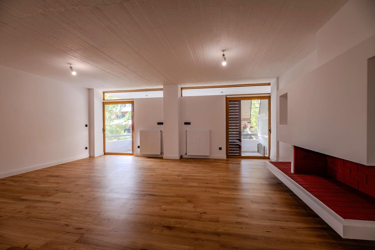 The apartment features two spacious bedrooms, a stylish bathroom, a welcoming living room with a cozy fireplace, and a fully fitted kitchen with built-in cabinetry. Bright and airy, the residence is enhanced by refined marble floors, modern aluminum frames, and large balconies that invite natural light. A security door ensures peace of mind, while central heating and air-conditioning units provide year-round comfort.