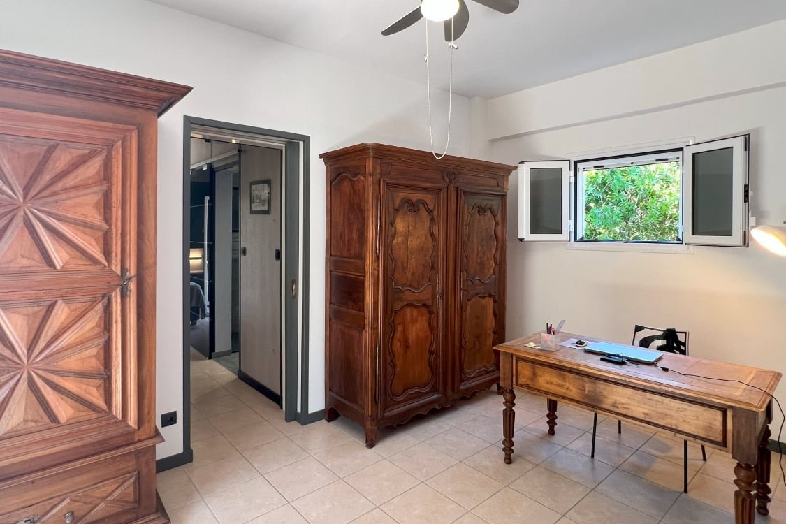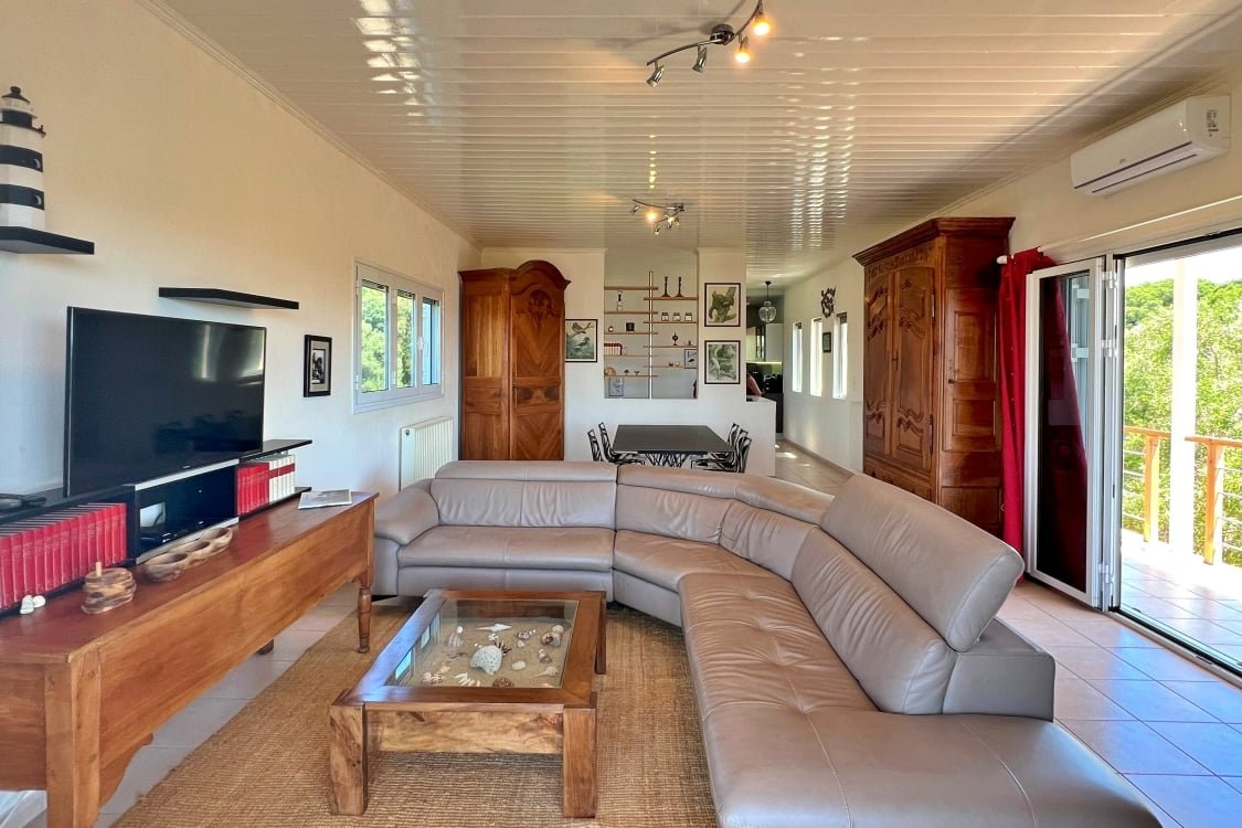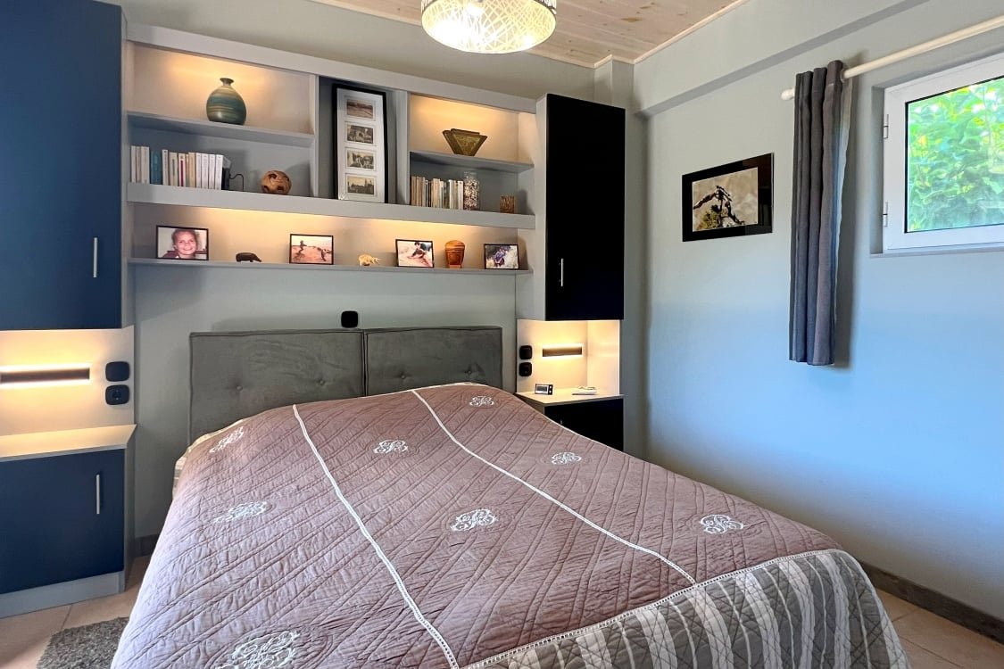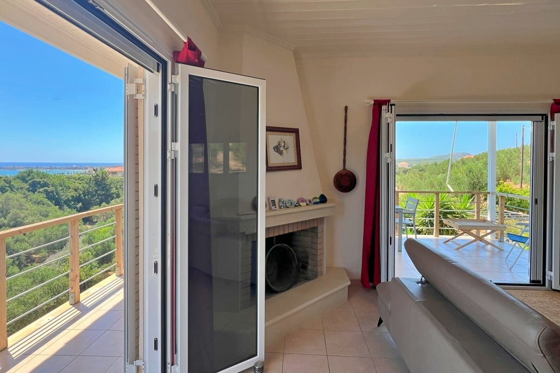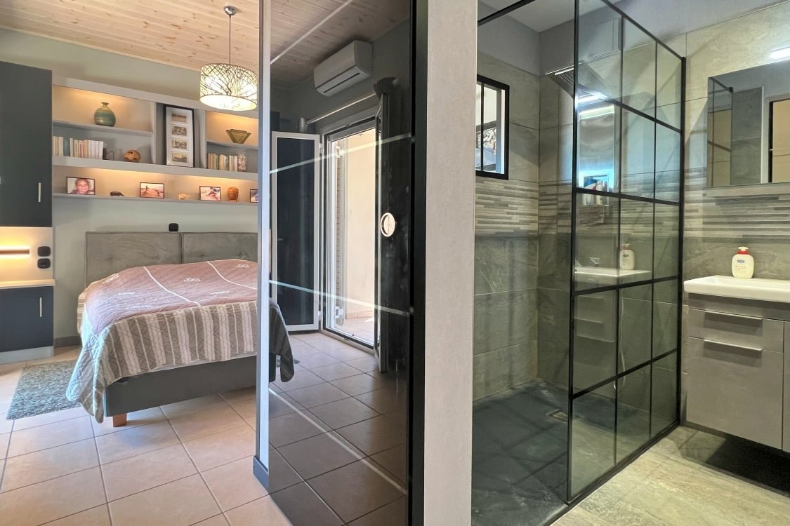 The main residence unfolds across three levels linked by an internal staircase. The upper level hosts an open-plan living area with fireplace, dining space, modern kitchen, and guest WC - all opening to a panoramic terrace overlooking the sea and surrounding hills. The mid-level features two en-suite bedrooms and an additional room ideal as an office or dressing area. The ground level includes a self-contained apartment with living room, kitchen, bedroom, and bathroom - perfect for guests or rental income.