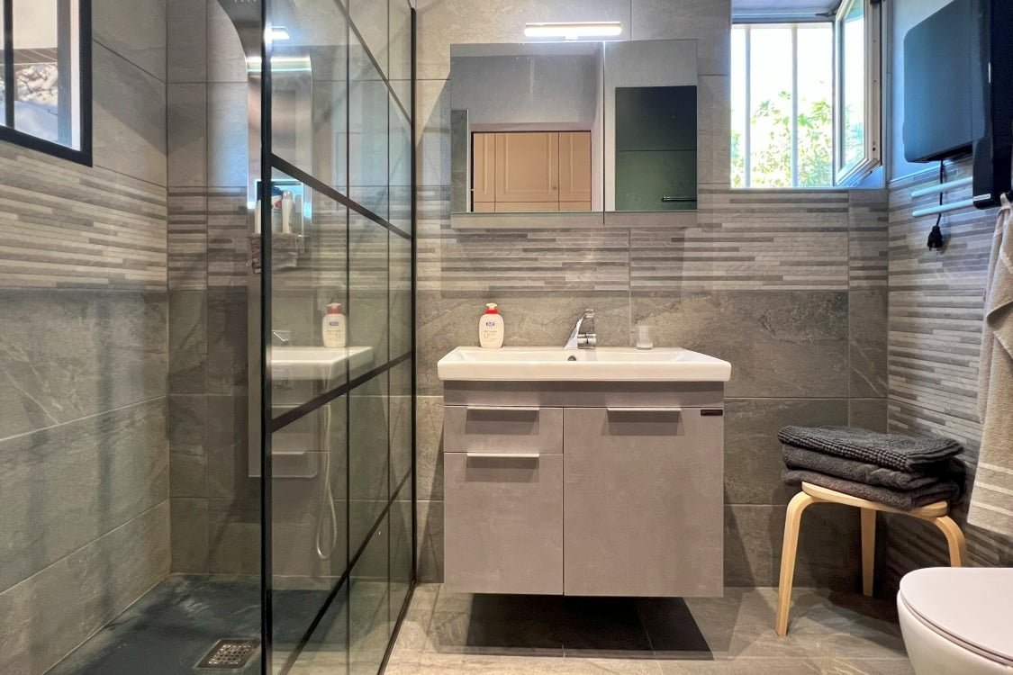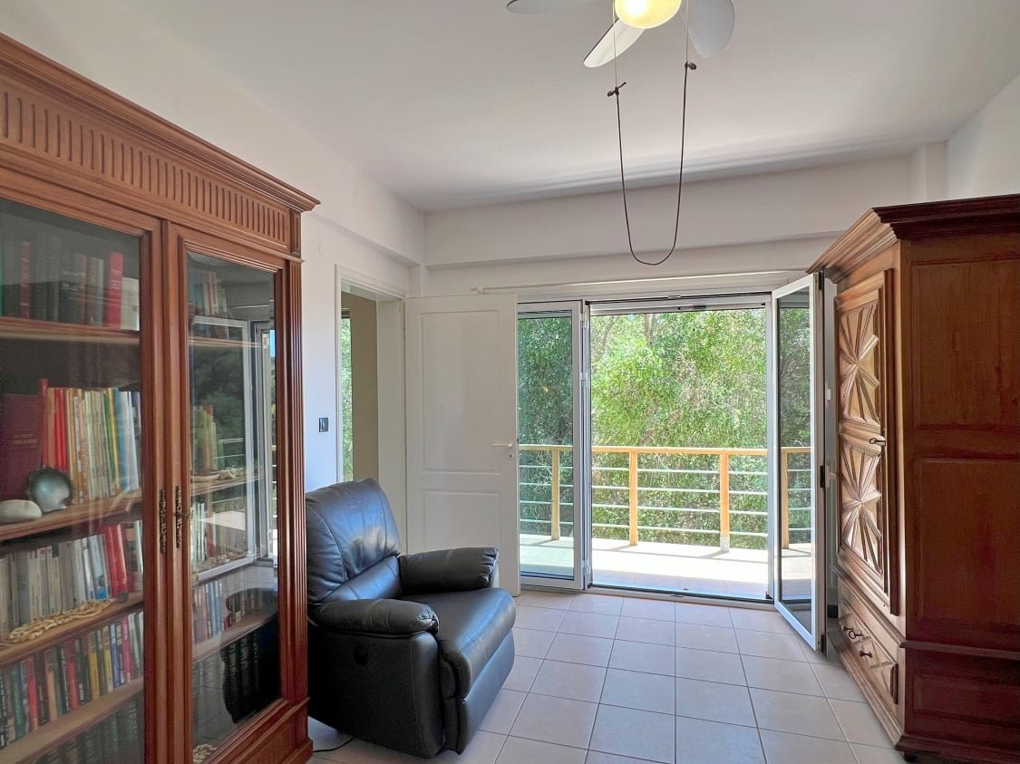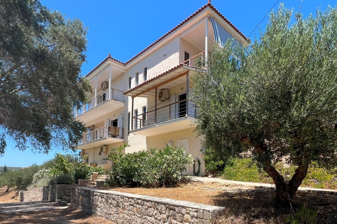 The main residence unfolds across three levels linked by an internal staircase. The upper level hosts an open-plan living area with fireplace, dining space, modern kitchen, and guest WC - all opening to a panoramic terrace overlooking the sea and surrounding hills. The mid-level features two en-suite bedrooms and an additional room ideal as an office or dressing area. The ground level includes a self-contained apartment with living room, kitchen, bedroom, and bathroom - perfect for guests or rental income.