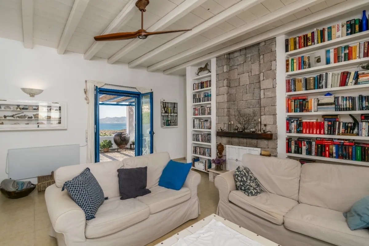 Built in 2009, the villa extends over 174.76 m² of living space on a vast 10,192 m² plot, creating a sense of openness and serenity. The design seamlessly combines traditional Cycladic architecture with modern comforts, featuring soft white tones, stone finishes, and large openings that frame the sea views from every angle.