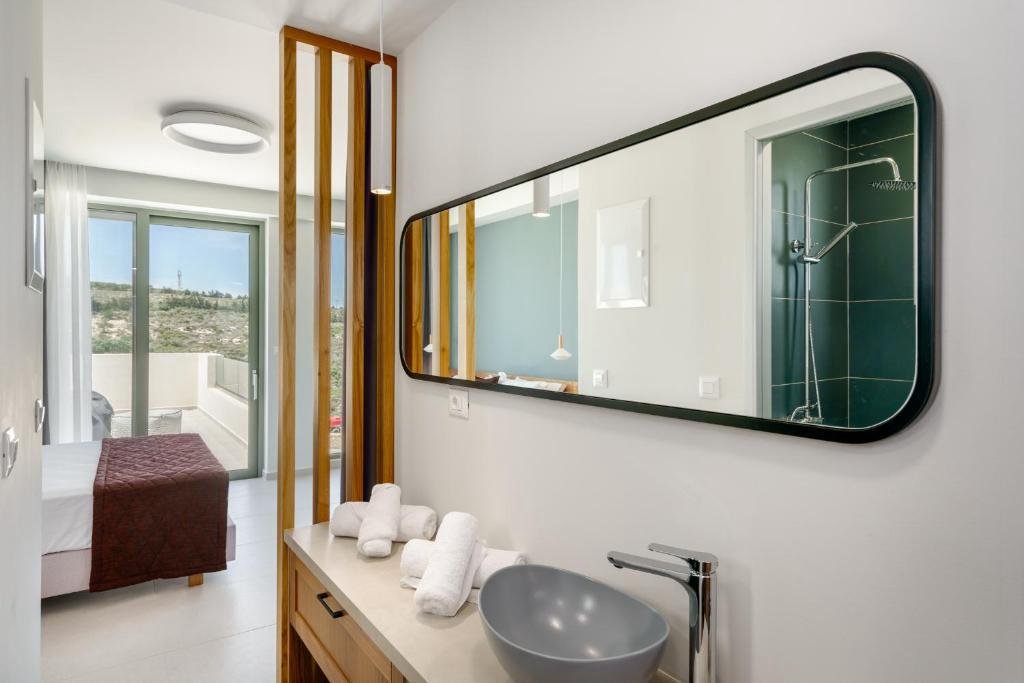 The interiors are defined by open-plan living spaces, natural wood finishes, and soft green tones that create a soothing, contemporary atmosphere. Expansive floor-to-ceiling windows bathe the interiors in natural light and open directly to private terraces with panoramic sea and mountain views.