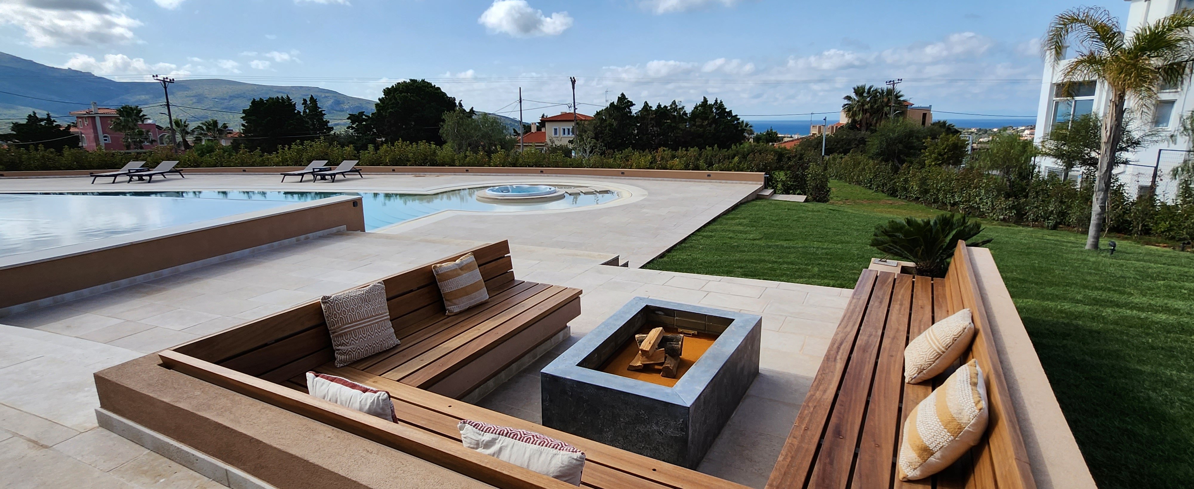 Aquathea is designed for year-round enjoyment, featuring a large swimming pool with integrated jacuzzi, calming water features, a fire pit lounge, and a covered BBQ pavilion connected directly to the main kitchen which is perfect for hosting gatherings in any season.
