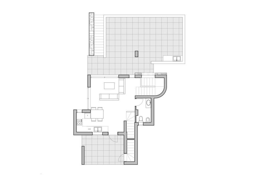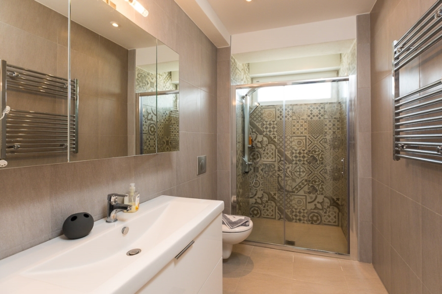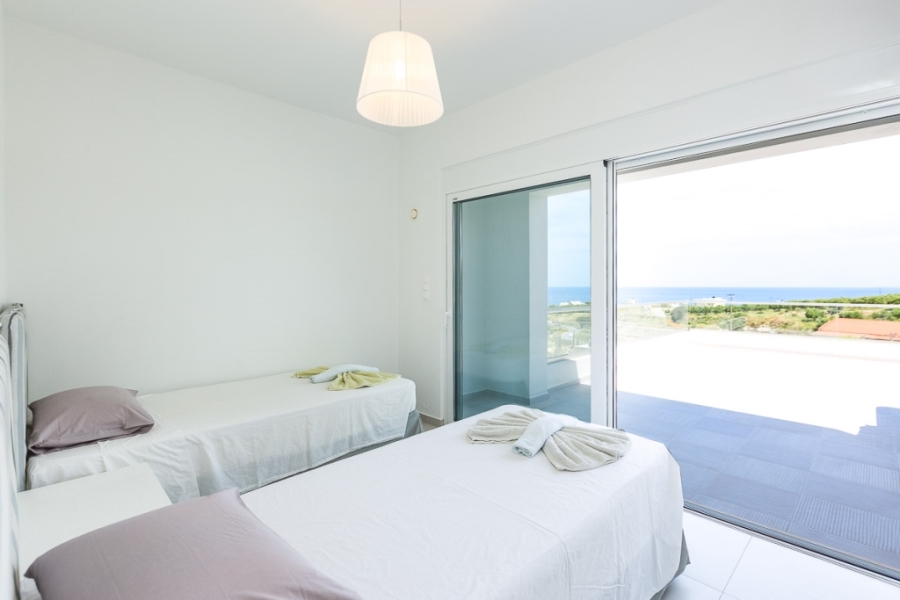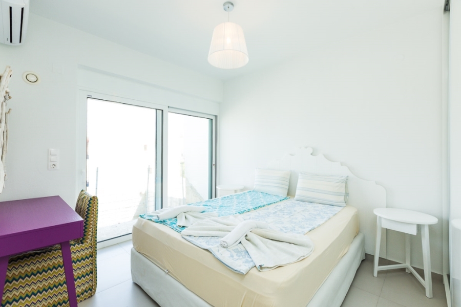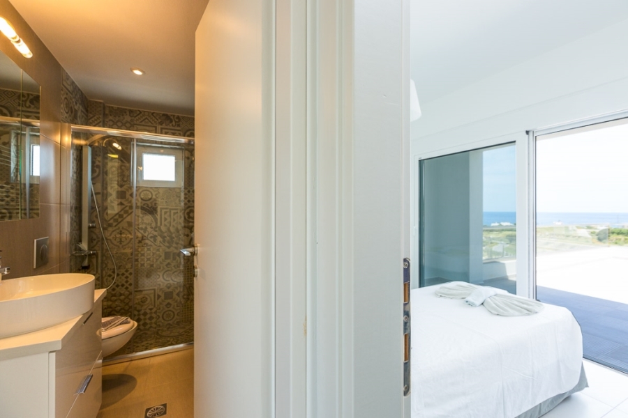 The ground floor welcomes you with a spacious open-plan living and kitchen area, where soft tones and natural light create a refreshing and relaxing atmosphere. Large sliding doors allow sunlight to flow inside and frame the beautiful, unobstructed views of the sea. A modern bathroom completes this level, adding practicality to everyday living.