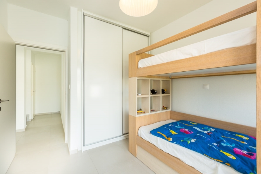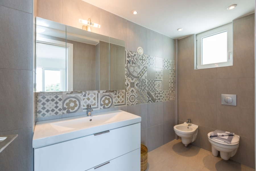 The lower floor consists of two comfortable and well-lit bedrooms, along with a stylish bathroom and a convenient storage room-an ideal layout for family members or guests seeking privacy and comfort. The upper level hosts the third bedroom with its own bathroom, opening onto a generous terrace that offers breathtaking panoramic sea views.