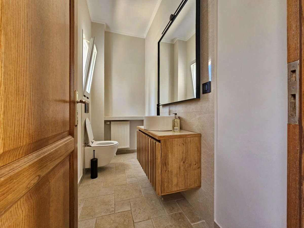 The property's two fully renovated floors provide spacious and stylish living areas, while the large ground floor remains unfinished, offering a rare opportunity to customize the layout according to personal preferences. This level includes multiple flexible rooms, two wine cellars, a sauna, and an expansive open-plan living area that could be transformed into a guest house, wellness retreat, or lucrative rental accommodation.